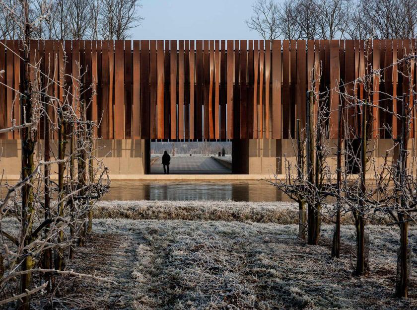 The rectangular building is mainly constructed with concrete that has been dyed to blend in with the local ironrich stone. The upper two thirds of the exterior walls are covered by a screen made of strips of weathering steel in varying widths. Some of the steel pieces have been slightly twisted, adding a textured design to the building.