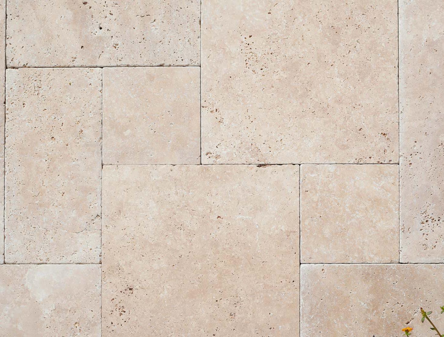 5. Travertine Stone Paving - Variable width 22/14/10 cm Variable Length 70/60/50/40/30/20 cm Depth 2cm Laid on 6cm leveling cement mortar screed