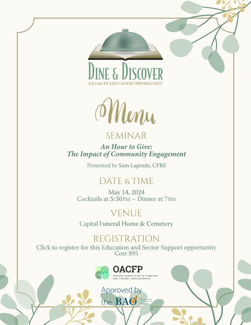 Our next Dine & Discover education event will be held on May 14th at Capital Memorial Gardens Funeral Home & Cemetery. Come out and join us for an evening of sector support with a special presentation from Sam Laprade, the Host of “An Hour to Give” on Rogers TV Ottawa & Country 101.1 FM, Fundraising Strategist & Coach, and Former Host “The Sam Laprade Show” on CityNews.