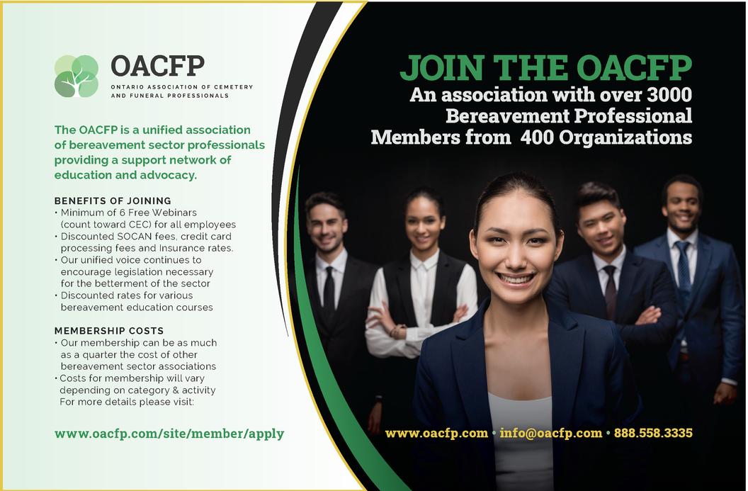 THE OACFP IS A TRADE ASSOCIATION THAT LEADS A STRONG AND EVOLVING BEREAVEMENT SECTOR IN ONTARIO. IT DOES THIS BY PROVIDING THE SECTOR’S EMPLOYERS AND EMPLOYEES WITH UNIQUE BUSINESS RESOURCES, PROFESSIONAL DEVELOPMENT, AND ADVOCACY, DESIGNED TO ENABLE THE SECTOR TO UNDERSTAND AND RESPOND TO THE CHANGING SOCIETAL AND BUSINESS CONTEXTS WITHIN WHICH OACFP’S MEMBERS OPERATE.
