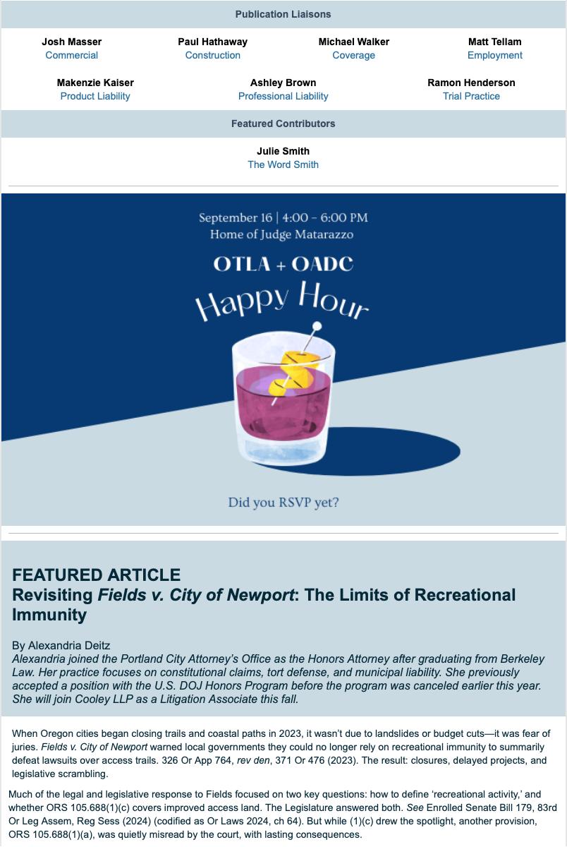 Coordinate and work as directed by the Newsletter Editor to arrange for timely submission of the Practice Group articles and case notes for publication in the OADC Newsletter. Specifically, you will need to submit 2 articles, 4 case notes, and 4 defense success stories for publication in the OADC newsletter which is published four times a year (you will receive newsletter deadlines under separate cover from our newsletter editor).