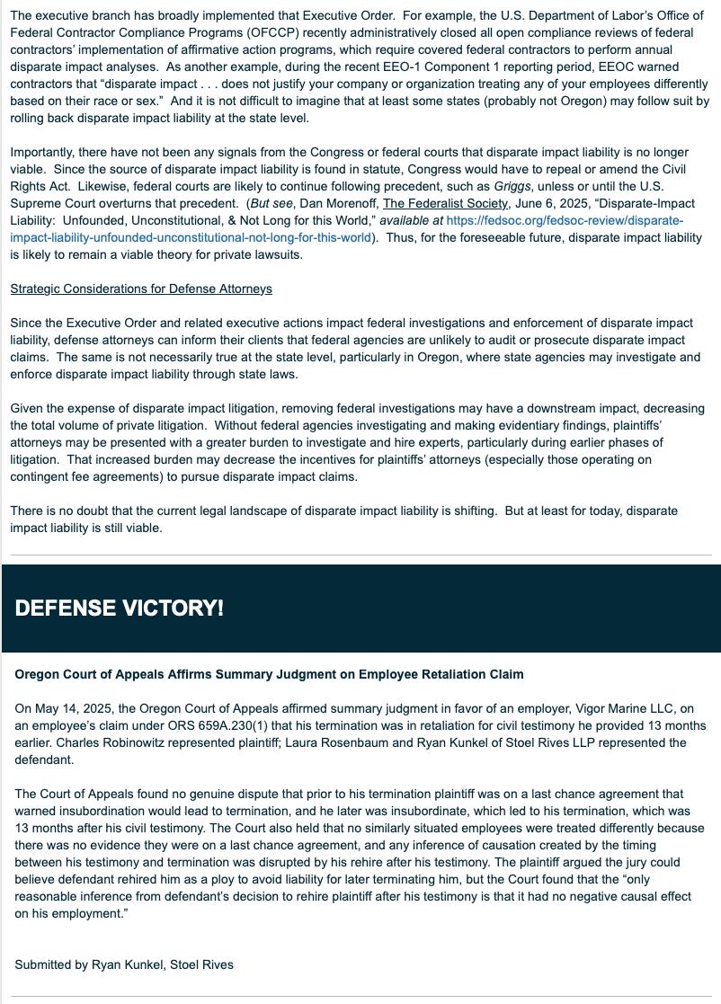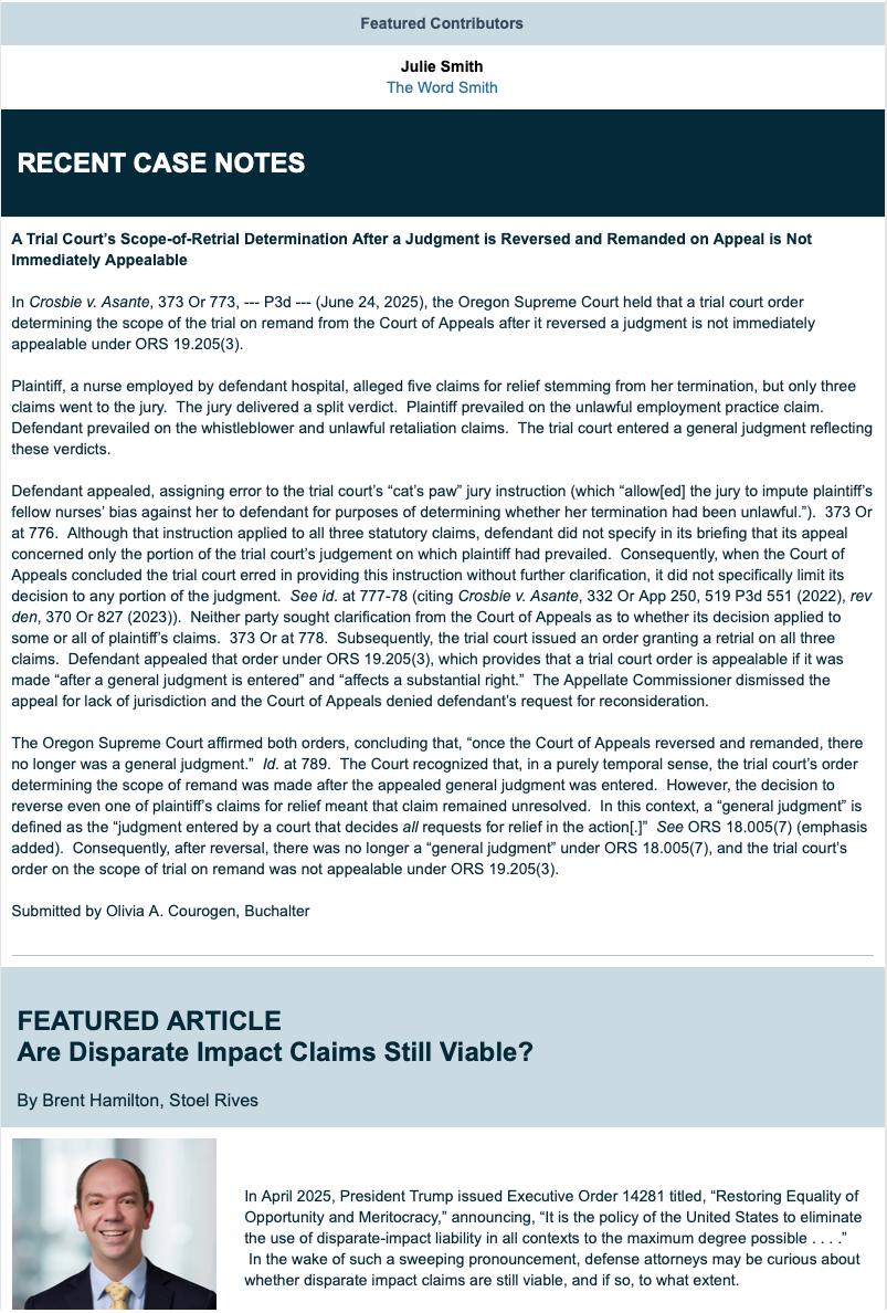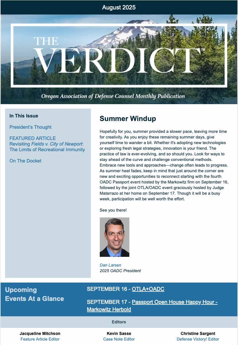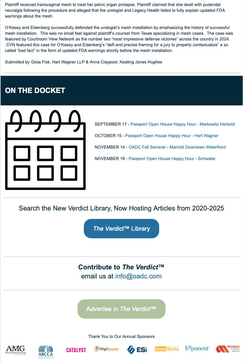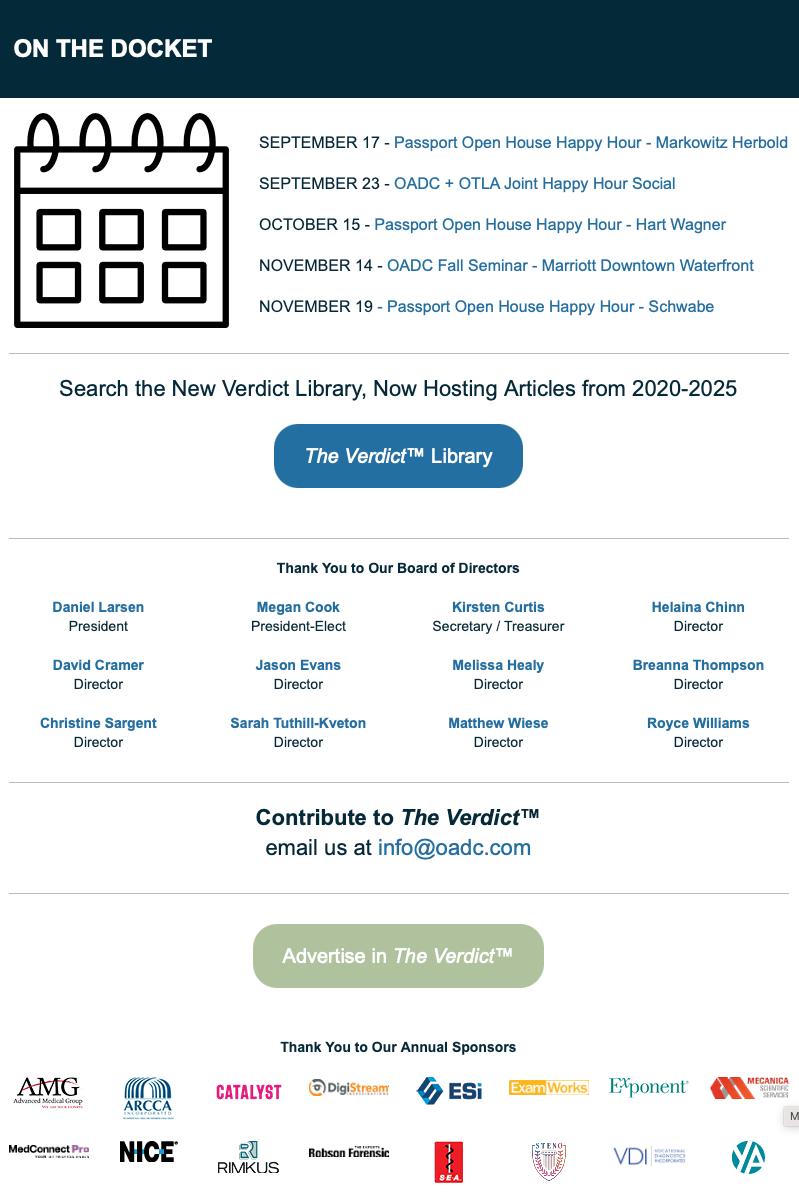 4. Submit 2 articles, 4 case notes, and 4 defense success stories for publication in the OADC newsletter, The Verdict, which is published four times a year (you will receive newsletter deadlines under separate cover from our newsletter editor, Jeanne Loftis).