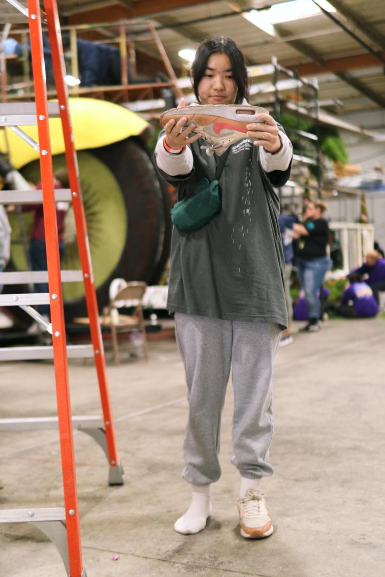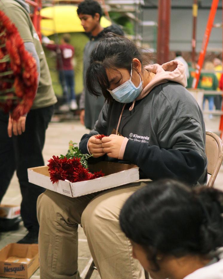 After receiving safety instructions, we all walked into the warehouse and were assigned to different floats with different tasks. Some of our members were able to get on top of the scaffolding for the floats and directly place flowers and leaves onto the floats. However, for those of us who were scared of heights, we were assigned to tasks of running the flowers to those on the scaffolding and prepping the flowers and leaves.