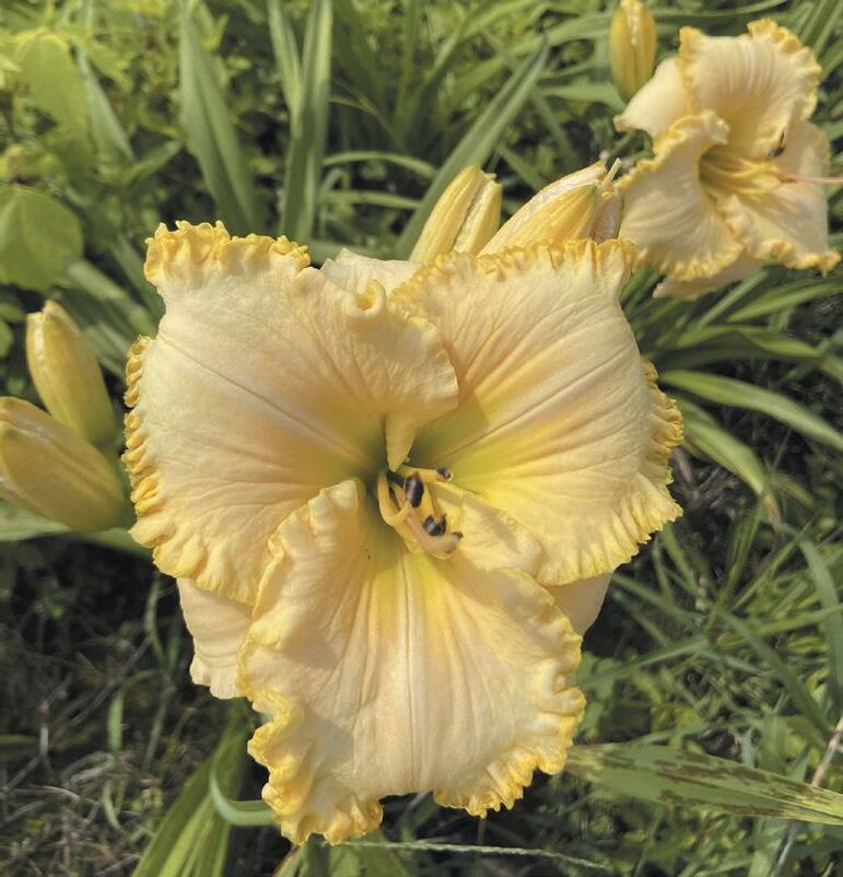 Large cream blooms are surrounded by an outstanding yellow ruffled edge. A high bud count results in lots of lovely blooms. 27” tall, 5 3/4” bloom. Early. Dormant. Rebloom. Tetraploid.