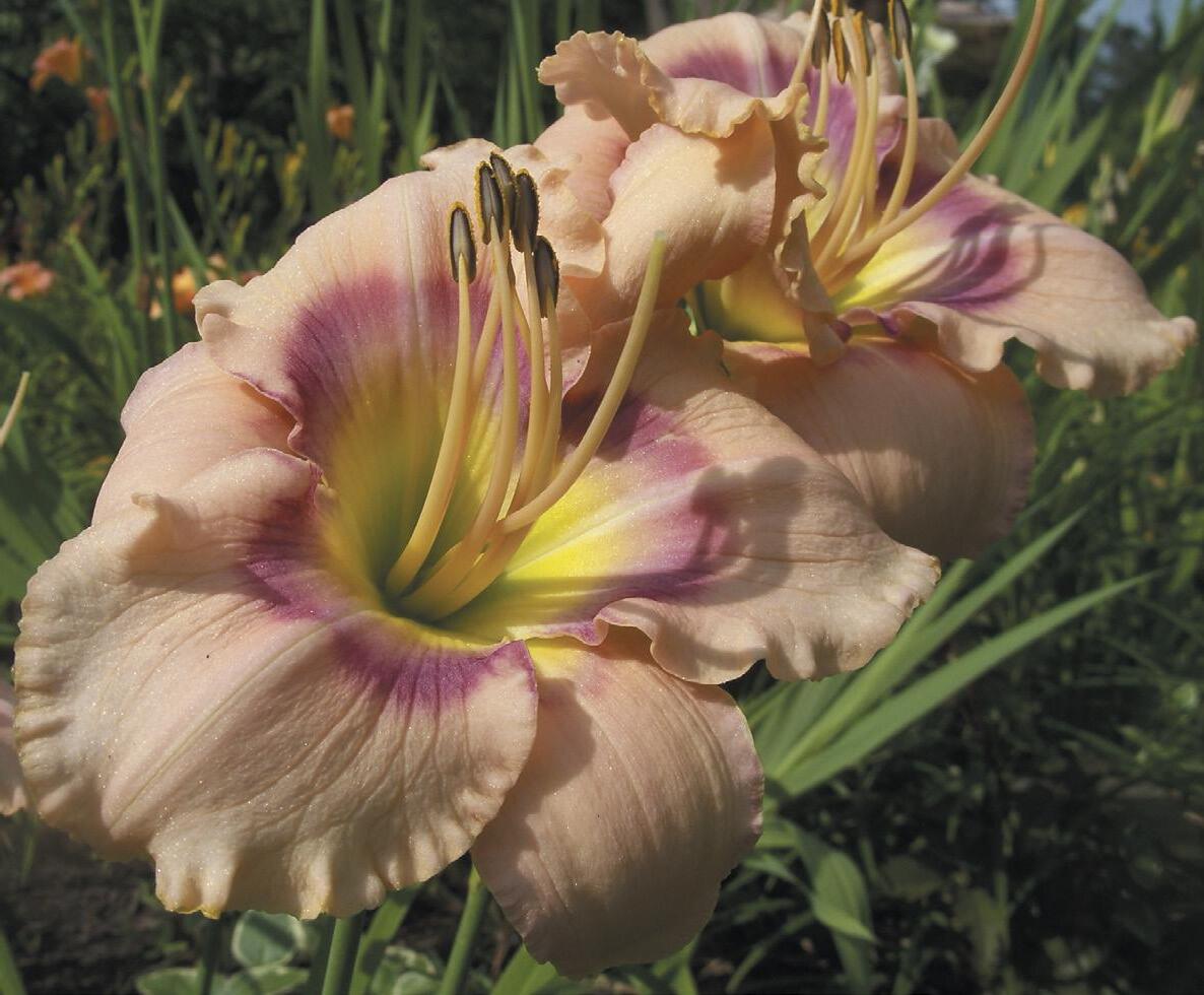 Light pink blooms with a hint of orchid-lavender and a soft yellow throat. Blooms have an interesting textured appearance. 28” tall, 6 1/2” bloom. Mid. Dormant. Rebloom. Tetraploid.