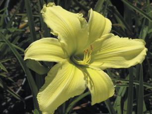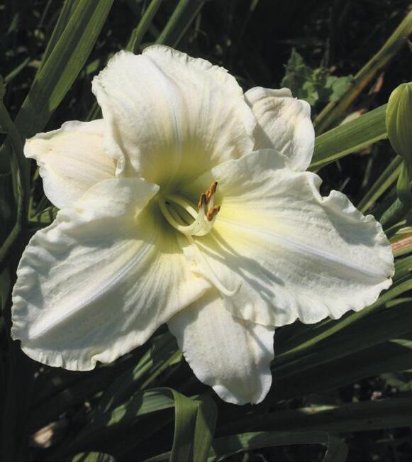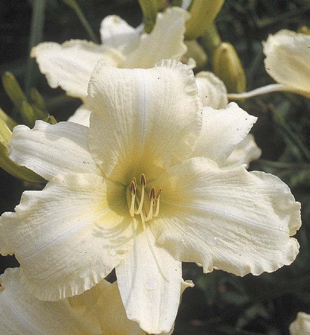 Makes an elegant statement. Big blooms are a lovely near white with ruffled edges and a soft yellow center. A prolific bloomer, good rebloomer and fast increaser. 27” tall, 5 1/4” bloom. Early to Mid. Dormant. Rebloom. Fragrant.