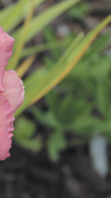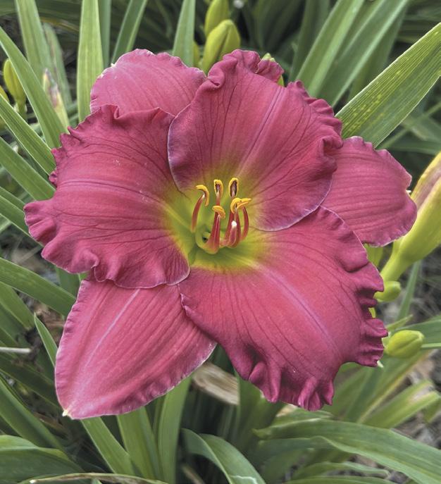 Big, round blooms of deep rose pink with ruffled edges. Registered as a mid-season bloomer, but one of our first to bloom.14” tall, 6” bloom. Mid. Evergreen.