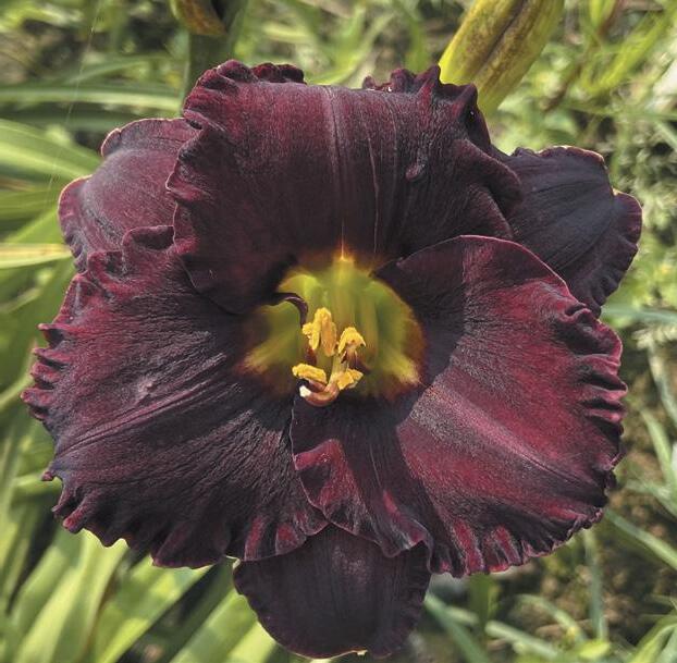 A customer favorite. Gorgeous deep purple blooms with a thin white edge. An excellent performer, we get a spectacular first round of blooms and reliable rebloom. 20” tall, 4 1/2” bloom. Early to Mid. Semi-Evergreen. Rebloom.