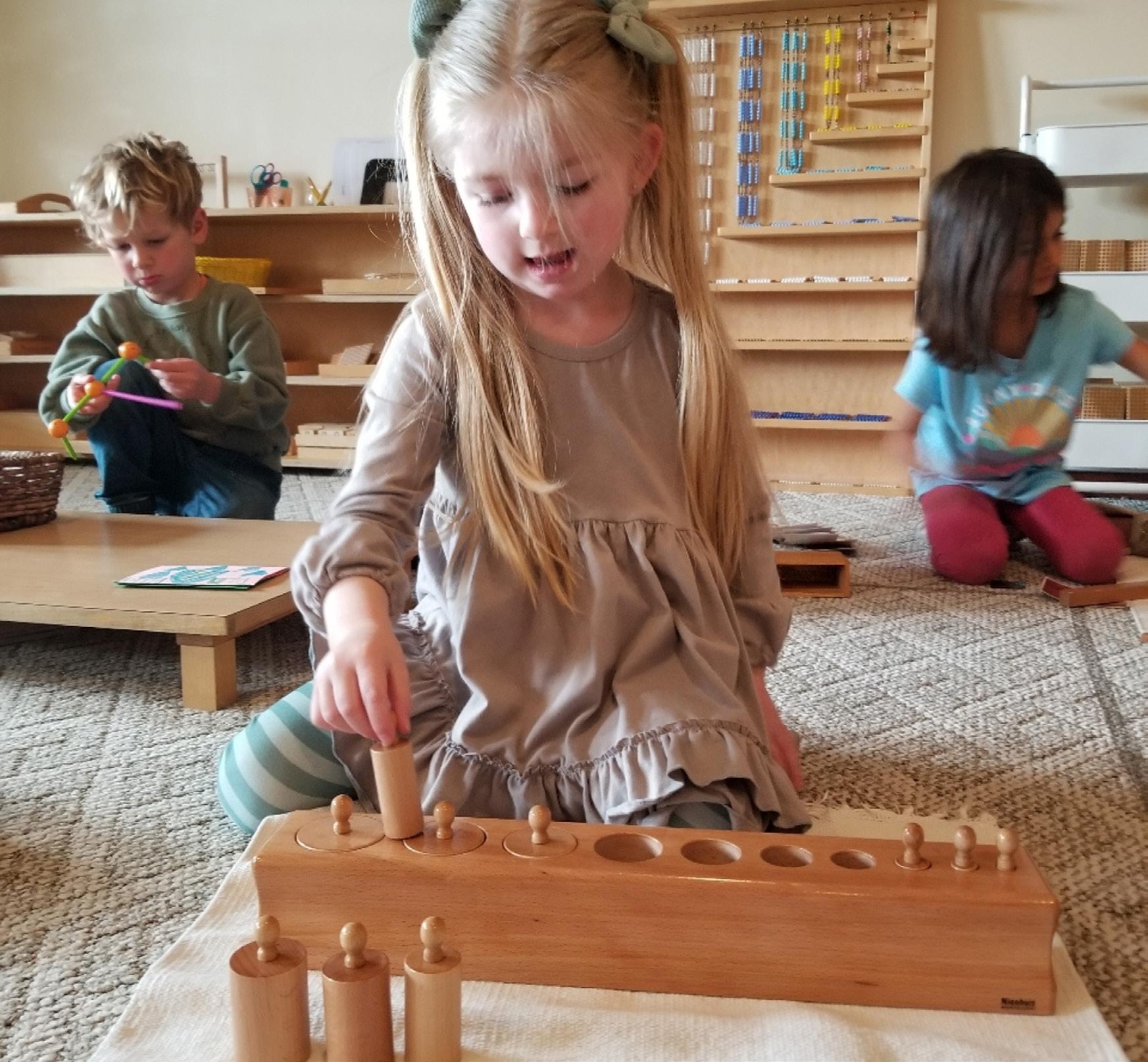 well as the child’s discriminating and differentiating skills that lead to abstract thinking. The materials make a child aware of their unconscious impressions and bring those impressions into conscious awareness. They allow the child to create a basis of order in their mind and allow intelligent exploration of the environment. The child’s motor coordination improves and, as the senses become refined, the child can gather more reliable and accurate information that allows for the awareness of beauty and enhanced artistic creativity. In addition, the materials aid the child in becoming more articulate, more analytical, and more prepared for intellectual activities.