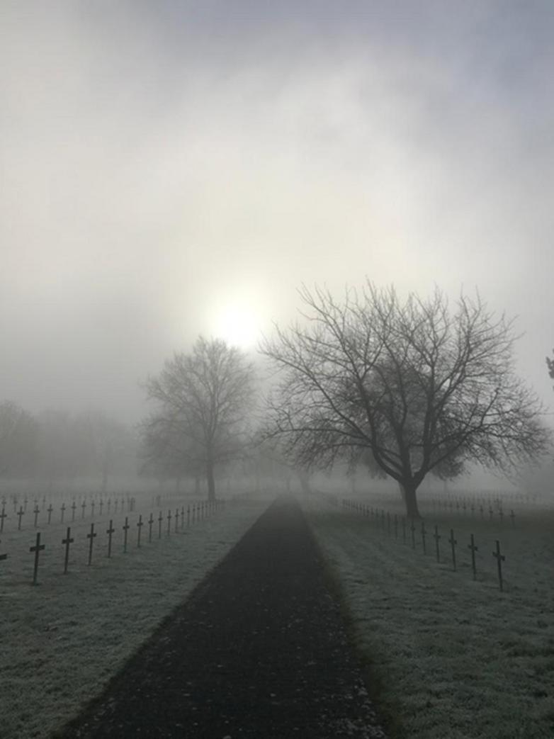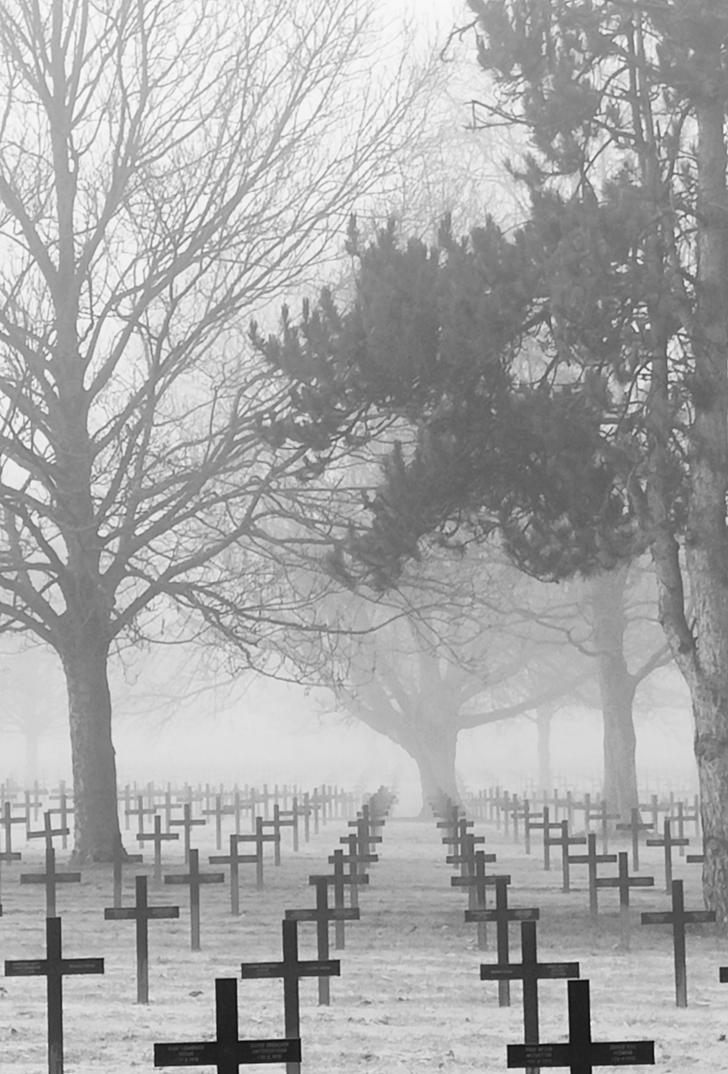 Crosses in the gloomy fog You could see the giant cross in the centre in beams of sunlight The trees were slowly drifting side to side The birds were an orchestra playing peacefully Why was the cemetery hidden away, out of sight? The trees were like huge books, full of the knowledge of what had happened. The grass was crispy-cold. The German cemetery.