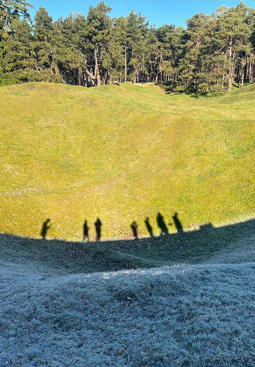 I saw the blazing beams of the bright sun, gazing down onto the emerald hills. Bumps in the land, we were told were muddy and hostile to gas, were filled with fresh daisies and freshly cut grass Beautiful The pine trees created a shadowed wood; again the sun gazed upon and through them. These trenches - merely dips in the land now, were eye-catching and natural. Surely this land was created by the wind and water. They lay there almost smiling. Beautiful.