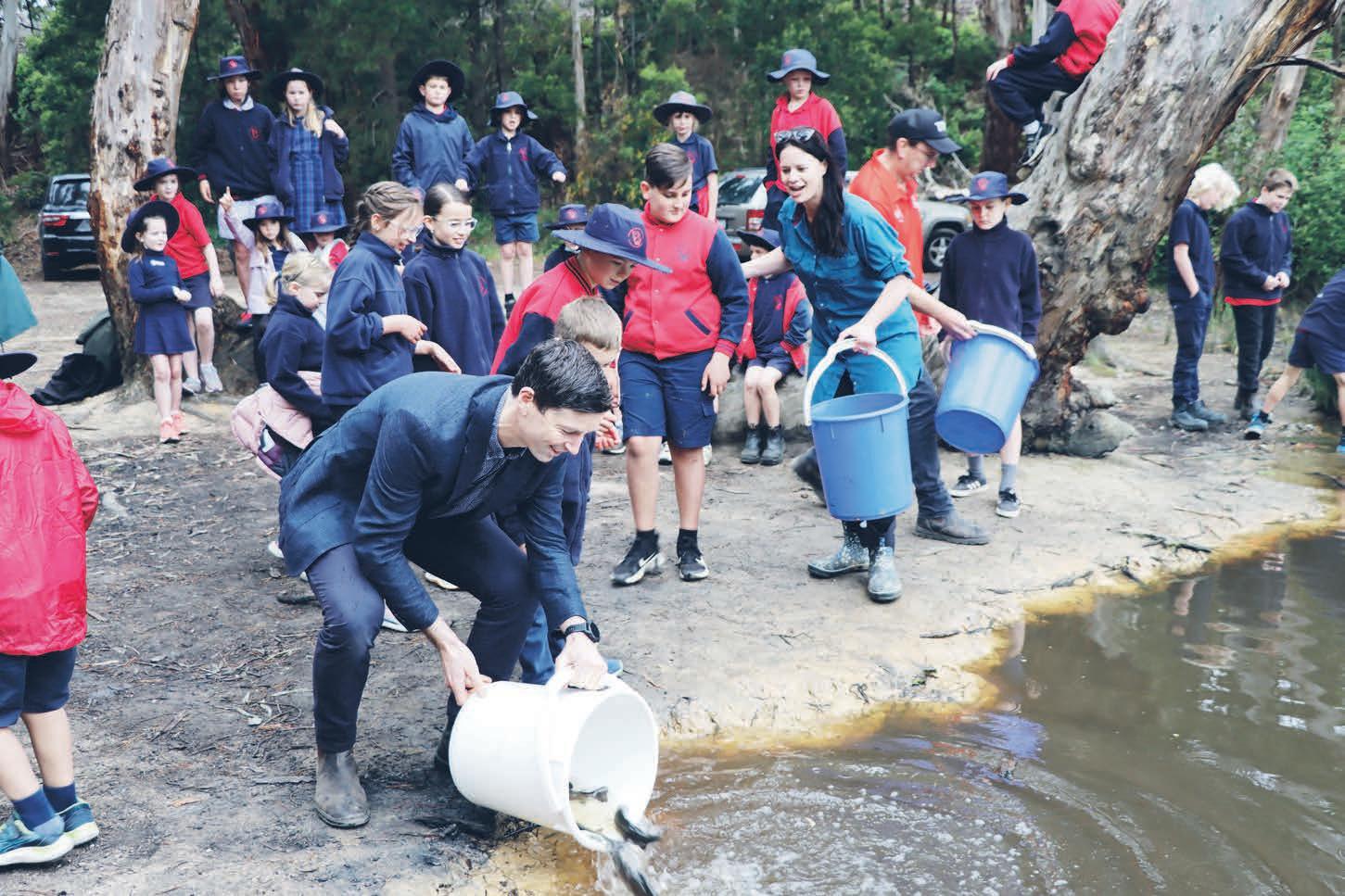 In an exciting local school excursion, Macedon Primary students helped Victorian Fisheries representatives release 250 rainbow trout into Nursery Reservoir, Macedon, on November 25. Principal Matthew Forrest had a go too, and proved handy with the bucket. With much hilarity, young fish were poured into the Res then eagerly tempted back to shore when students tried their luck at fishing. Restocking of the lake is organised by Victorian Fisheries and takes place every few years. Macedon Primary launches Landcare fishing program page 27.