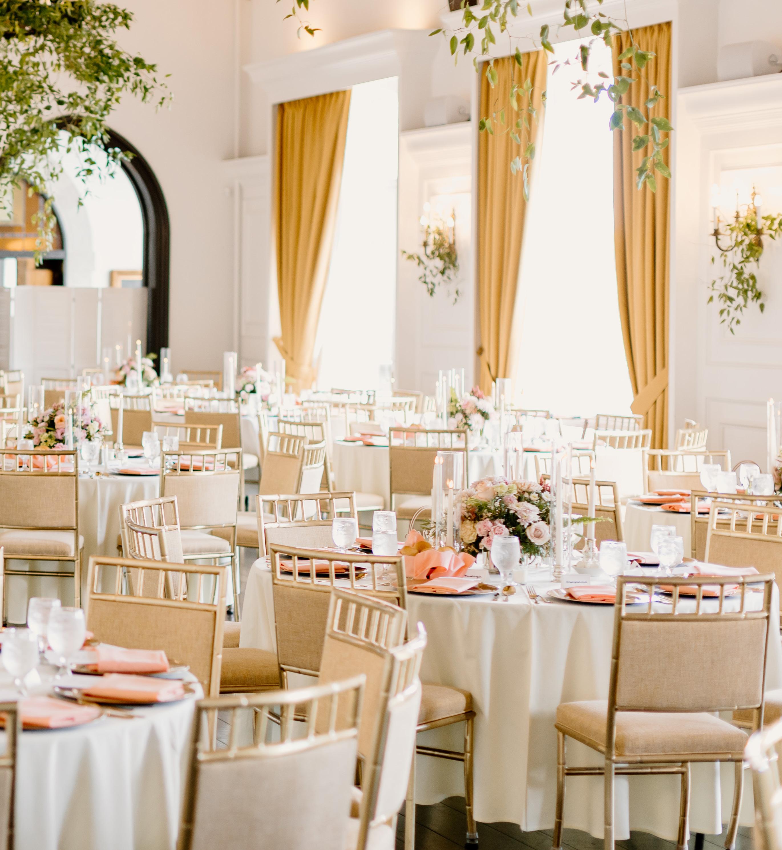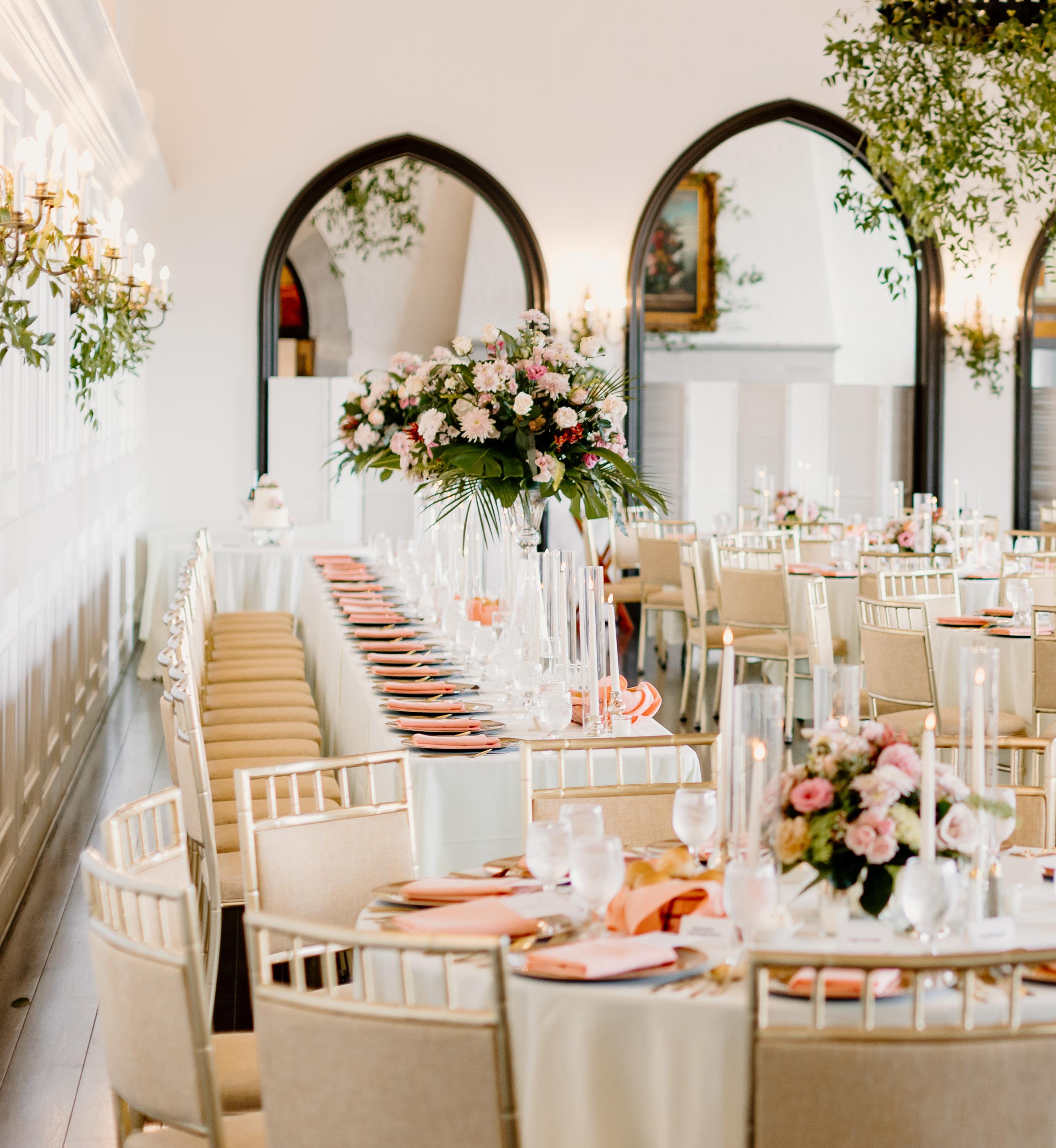 The grand hall beautifully decorated for a wedding