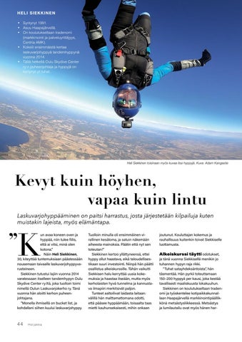 un avaa koneen oven ja hyppää, niin tulee fiilis, että ai vitsi, minä olen kotona.” Näin Heli Siekkinen, 30, kiteyttää tuntemuksiaan päästessään nousemaan taivaalle laskuvarjohyppyvarusteineen. Siekkinen tutustui lajiin vuonna 2014 varatessaan itselleen tandemhypyn Oulu Skydive Center ry:ltä, joka tuolloin toimi nimellä Oulun Laskuvarjokerho ry. Tänä vuonna hän aloitti kerhon puheenjohtajana. ”Monella ihmisellä on bucket list, ja kohdallani siihen kuului laskuvarjohyppy.