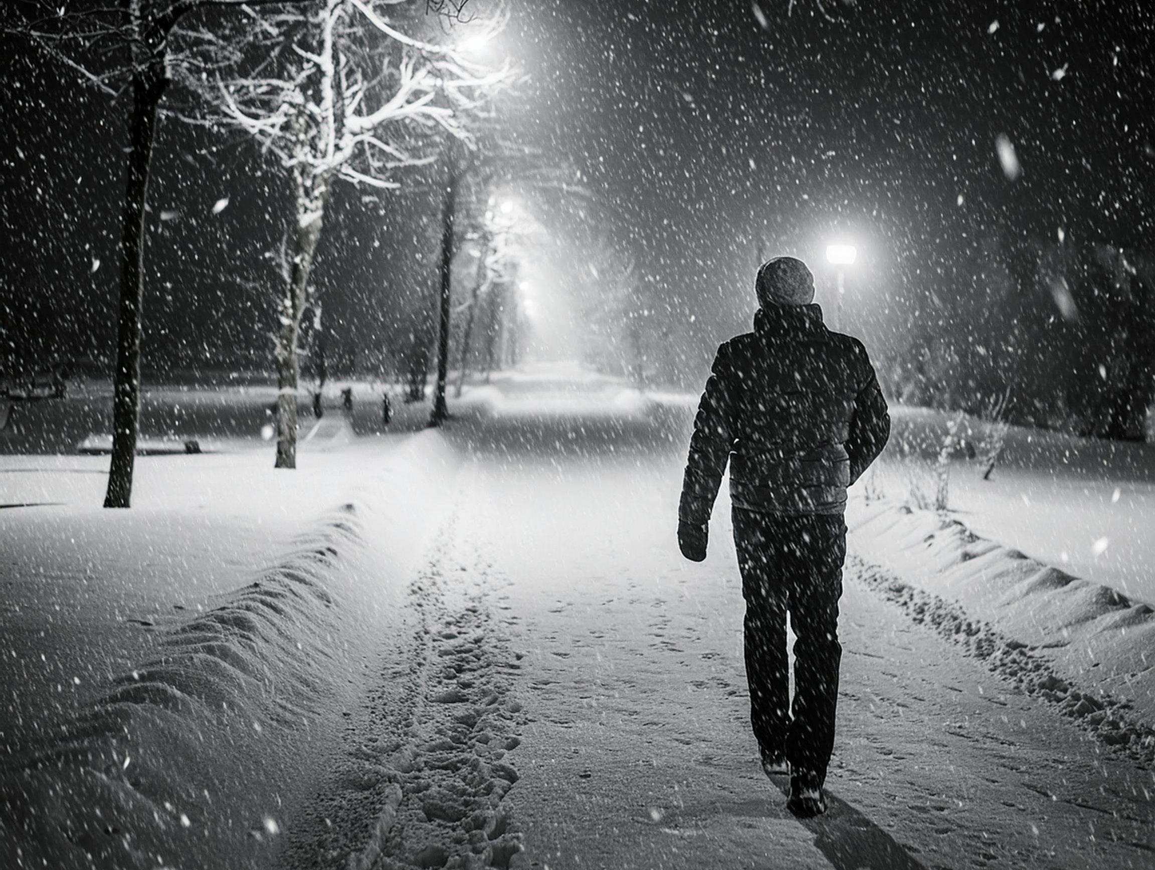 Kuva on tehty tekoälyllä. Kuvan henkilöltä puuttuu jalanjäljet. Puiden oksat ovat epämääräisiä kuten myös puiden asettelu ja ylimääräiset kannat, jotka sojottavat lumen läpi. Oikealla näkyy myös katuvalo, joka on epäloogisesti pystytetty hangen keskelle.