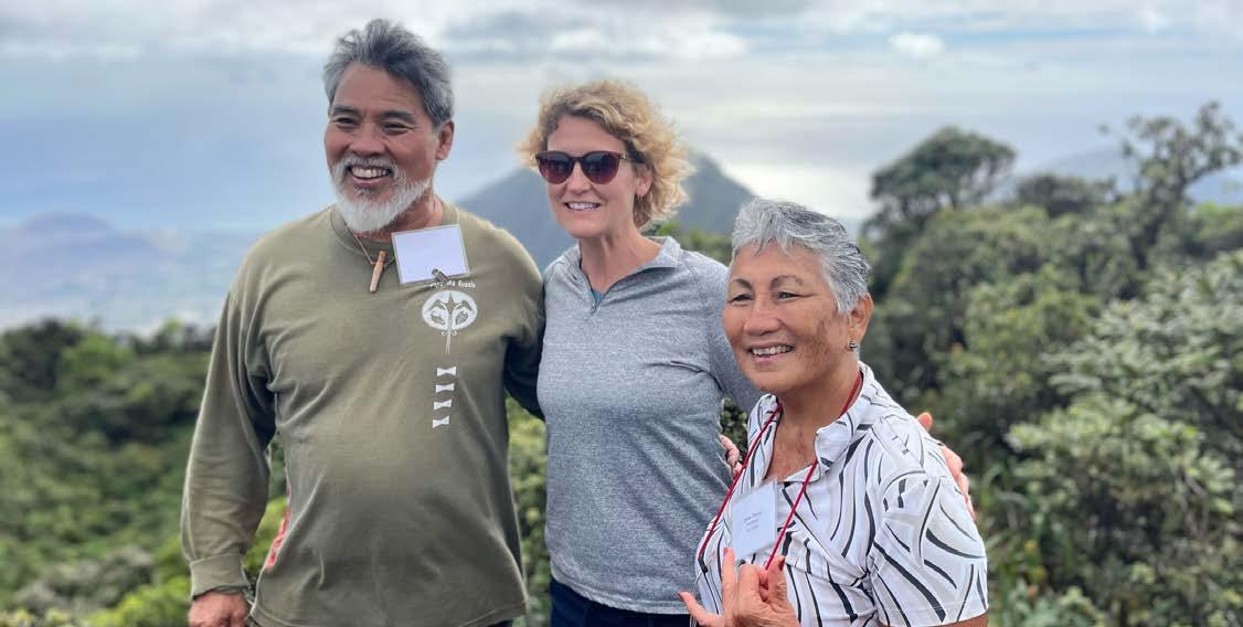 ABOVE Participants of a recent REPI workshop on O'ahu (left to right): Sam 'Ohukalani'ōhi'a Gon III, Senior Scientist and Cultural Advisor for The Nature Conservancy of Hawai'i, serving as cultural and spiritual advisor for the visit; Kristin Thomasgard, REPI Program Director; and Dawn Chang, principal of Ku'iwalu Strategic Planning and Facilitation Firm, serving as forum facilitator. PRECEDING PAGE, TOP Workshop participants visited Sentinel Landscapes including the agricultural fields at Lands of Līhu'e, which REPI contributed to protecting with partners from Federal and State agencies and non-governmental organizations. PRECEDING PAGE, BOTTOM U.S. Army Garrison Deputy Director Brandi Skasik (left), USAGHI Natural Resources Manager Kapua Kawelo (center), and Commanding Officer MCBH Colonel Speros Koumparakis, at the summit of Ka'ala.