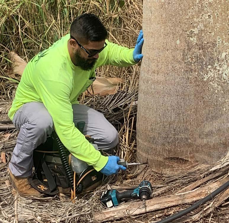 FACING PAGE A coconut palm at Schofield Barracks with telltale signs of CRB damage after CRBs chew through developing leaves at the crown of the tree, they unfurl with 45-degree-angled "v-cuts." LEFT CRB Response staff demonstrate how to perform pesticide injections to CRB damaged palm trees, a technique used to treat trees damaged by CRBs. BELOW The CRB larvae can grow up to 4 inches before they pupate into their adult form. WWW.CRBHAWAII.ORG
