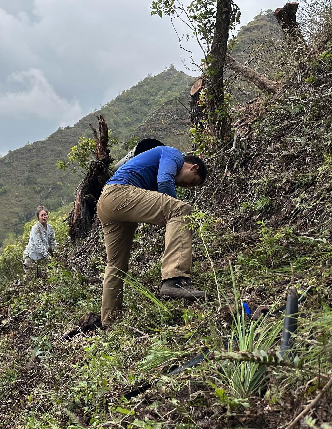 The beautiful curved hāhā flowers, illustrated by Tressa Hoppe. PRECEDING SPREAD Outplanting locations are chosen based on habitat requirements of the plants (north facing slopes, elevation, etc.) and ANRPO natural resource (NR) management technicians Aaron Pila (with auger) and Krista Lizardi, along with NR field team leader Keith Adams, are well adapted to working on steep terrain to boost populations of native Hawaiian plants in the wild.