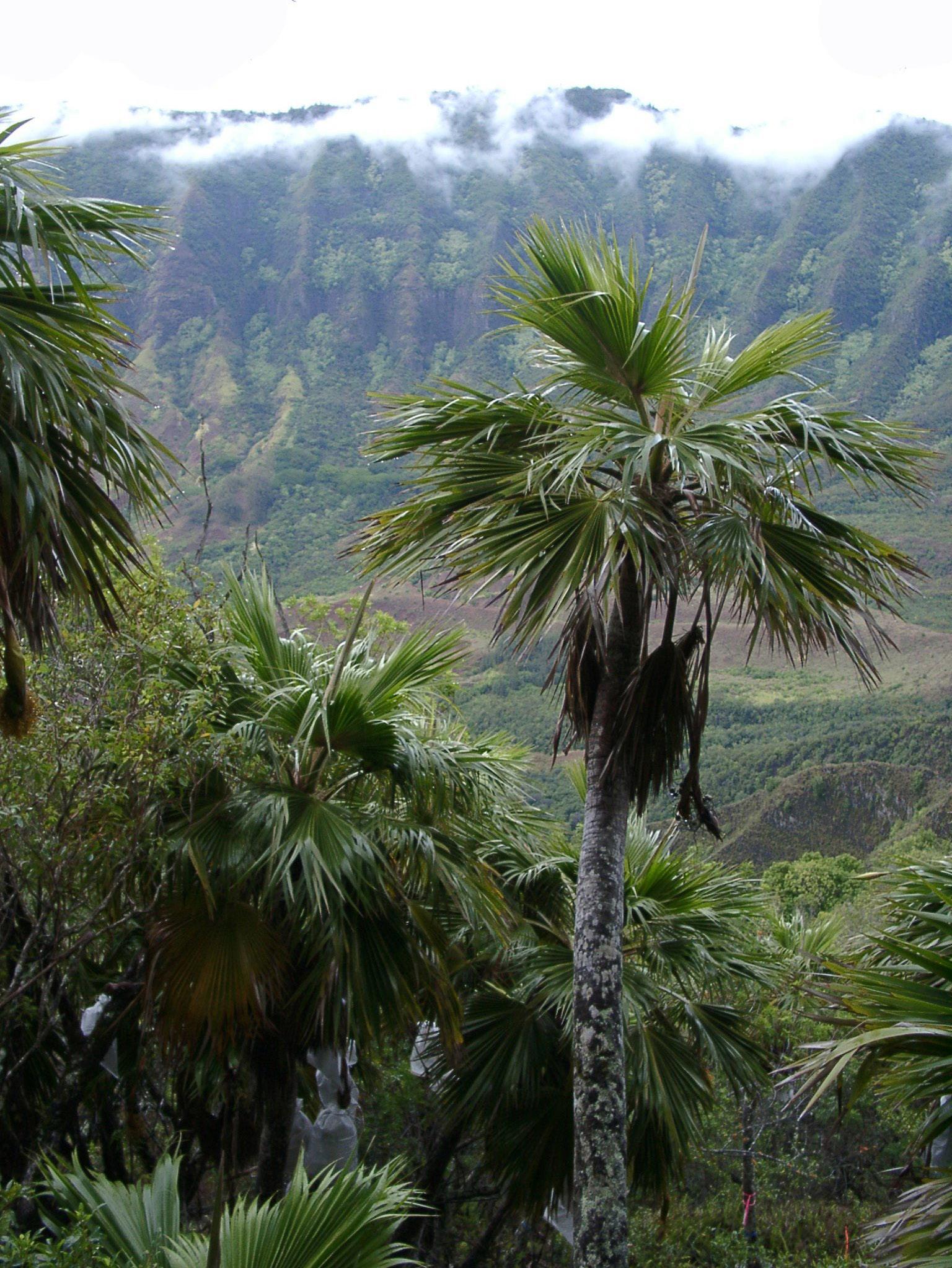 The name loulu refers to all of the Hawaiian Pritchardia species and in fact, all but three species of Pritchardia in the world are native to Hawai'i. In total, there are 24 native loulu species found across the Hawaiian Islands. Besides the Ka'ala loulu, O'ahu is home to four other loulu species, one farily common and three very rare, all found on the Ko'olau Mountains. While O'ahu species face the most immediate threat from CRB, all Hawaiian loulu could be devastated by CRB if it spreads through the island chain. loulu leaves were traditionally used for thatching and weaving, while immature fruit, or hawane, which have a similar taste to coconut, were eaten.