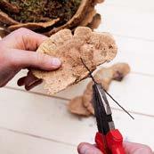 Den Pinholder auf den Baumstamm anbringen und mit Schrauben fixieren. Die Steckschaum-Kugel wässern, mit Moos ummanteln und auf den Pinholder stecken. Baumpilze mit Rohdraht andrahten. Anschließend schuppenartig im unteren Bereich der Kugel einstecken. Alle weiteren Werkstoffe einarbeiten.