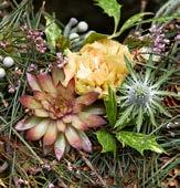 Aus der Steckunterlage eine Hälfte des Frischblumensteckschaumes entfernen und die Unterlage wässern. Sempervivum in die entstandene Freifläche einpflanzen und ggf. auf Holzspieße stecken, um sie ins Werkstück einzuarbeiten. Die andere Hälfte des Steckschaumes mit Grün locker bestecken und mit Bindedraht umwickeln. Anschließend mit den übrigen Werkstoffen ausfüllen.