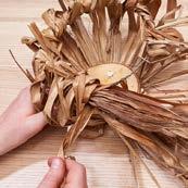 Die Gräser mithilfe von Bindedraht zu einem langen Strang wickeln. Die Steckschaum-Kugel wässern und halbieren. Danach den Gräser-Strang mit Efeunadeln spiralförmig auf der Halbkugel befestigen. Nun die Floralien einstecken. Das Werkstück anschließend in eine Schale setzen.