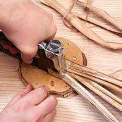 Die Unterlage auf das Rindenstück nageln. Dann den Frischblumensteckschaum in die gewünschte Größe schneiden und wässern. Diesen auf die Nägel und die Unterlage stecken. Anschließend die Floralien einarbeiten. Zapfen und Baumpilze mit Rohdraht andrahten und ins Werkstück einarbeiten. Zuletzt die Kerze mit Oasis Fix auf dem Rindenstück befestigen.
