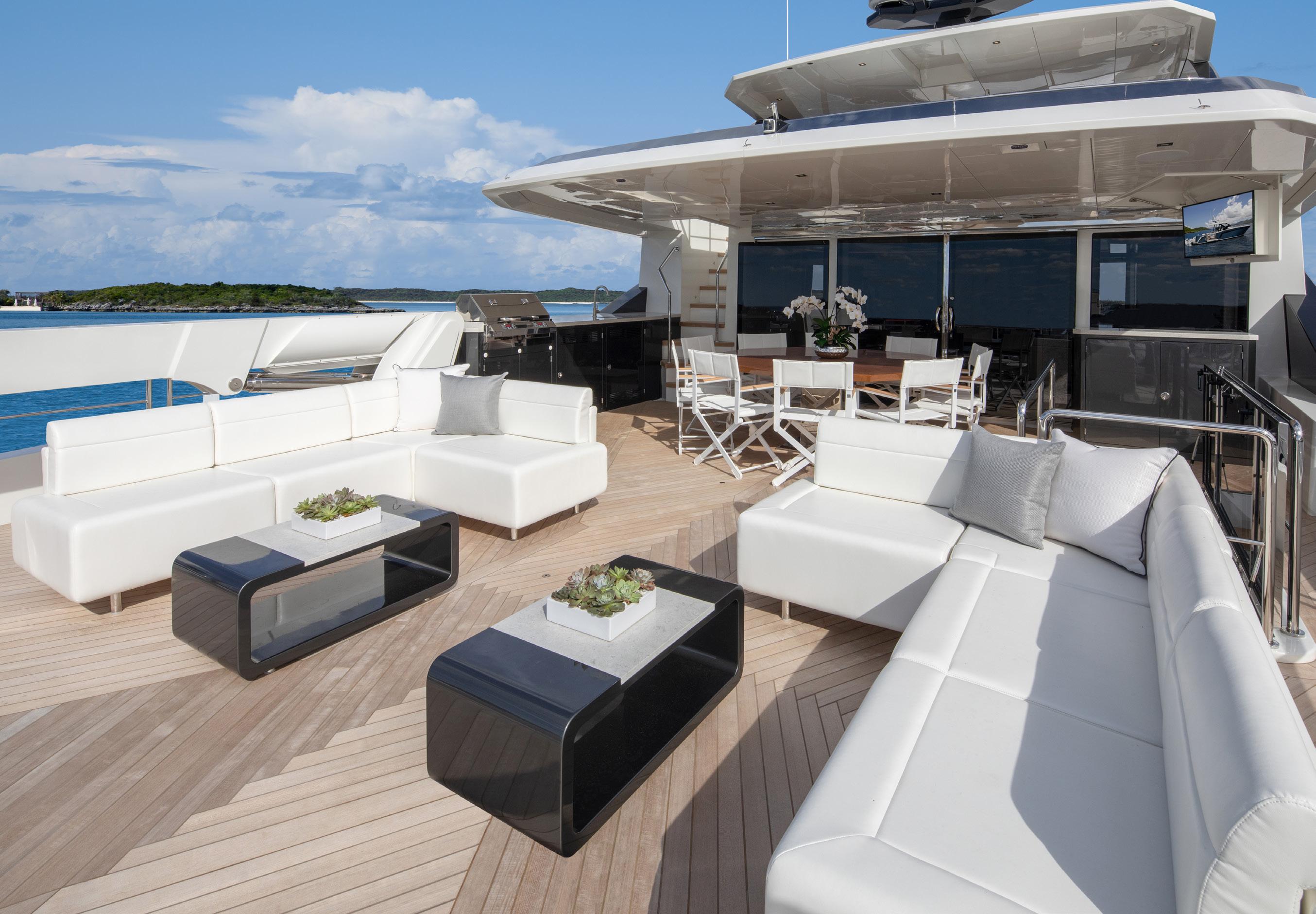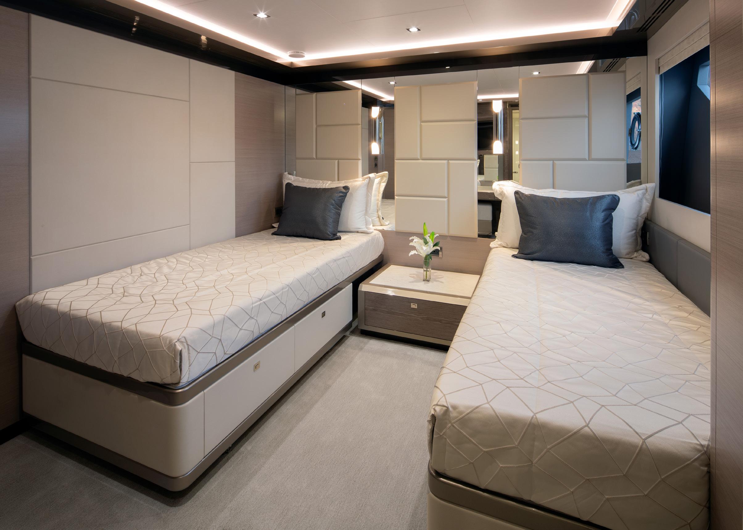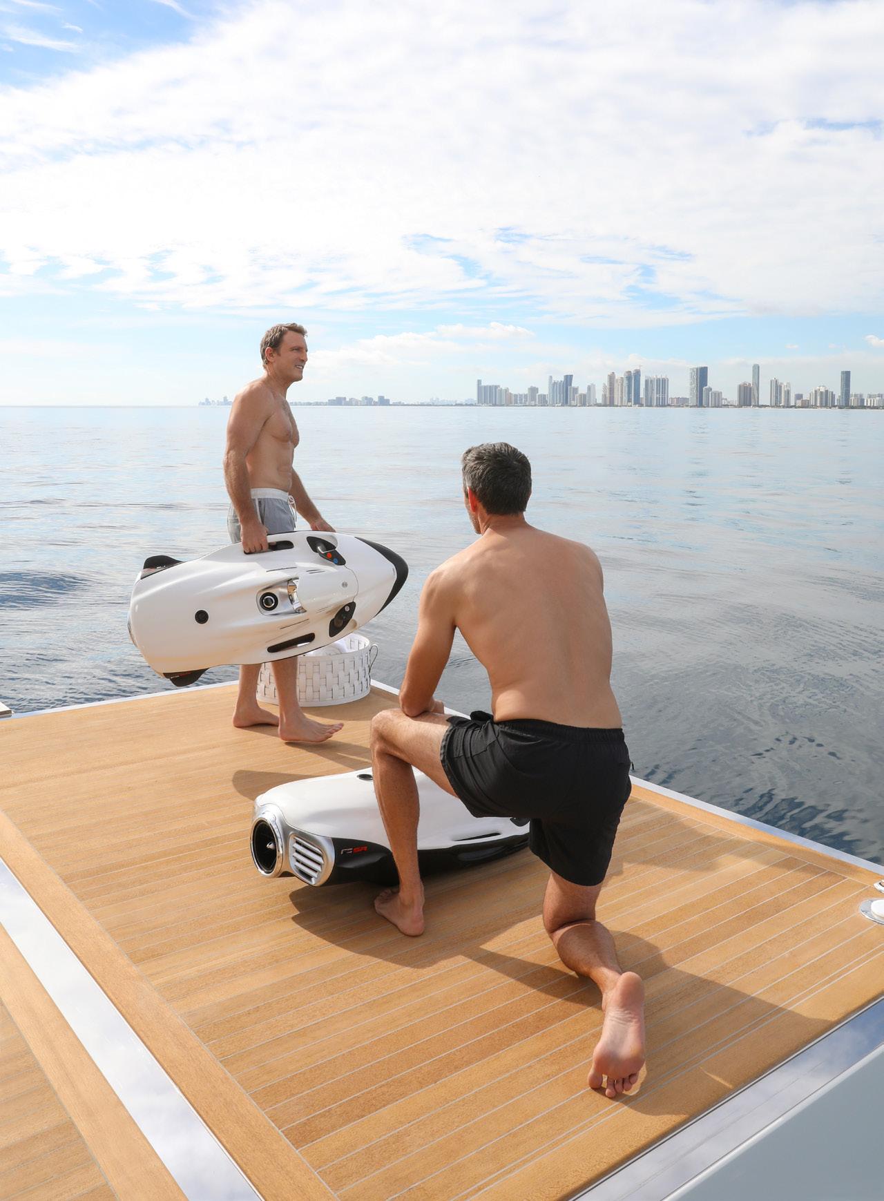 Just below the aft main deck is the beach club that is sure to be a favorite spot onboard. This space expands open via the fold-down transom, creating ample deck space to enjoy the water. The beach club is perfect for after-dinner conversation, early-morning coffee, late-night stargazing and everything in-between. With its own bar, fridge and beautiful views, it’s a private oasis for the owner and guests.