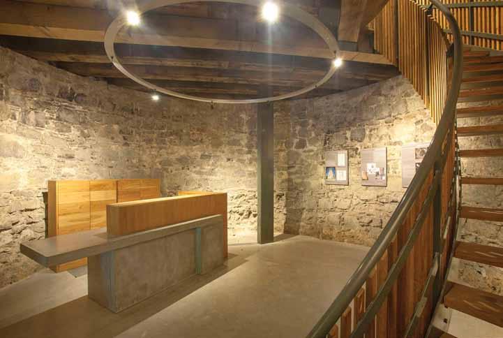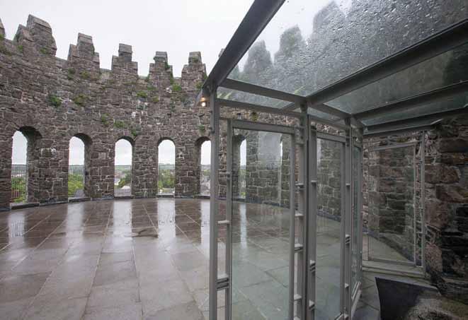 A modern viewing platform was installed at roof level. Precast concrete beams had to be lifted by crane over the crennellated parapets and carefully positioned in place. The floor was finished with limestone paving and the window openings fitted with iron grilles.