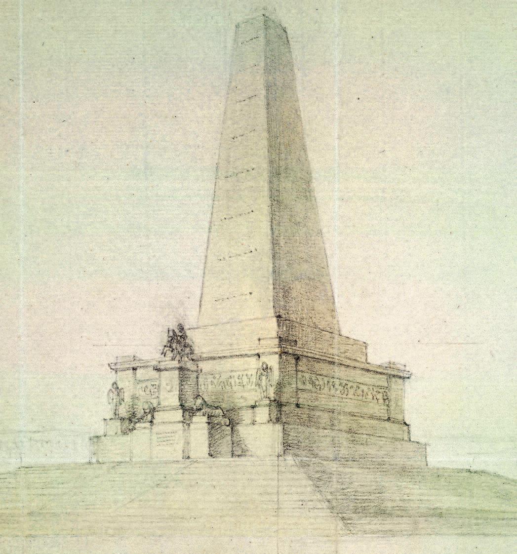 Top: Perspective sketch of the Wellington Testimonial by Robert Smirke (1780-1867), dated 1815. It depicts the obelisk and base set on a truncated pyramid of steps. The sketch includes an equestrian statue of the Duke of Wellington on horseback (facing the city) flanked by lower pedestals surmounted with triumphal lions The pedestals were constructed However, due to lack of funding, the statuary was never created, and the pedestals were subsequently demolished c 1860 Reproduced courtesy of the Royal Institute of British Architects (RIBA20512)