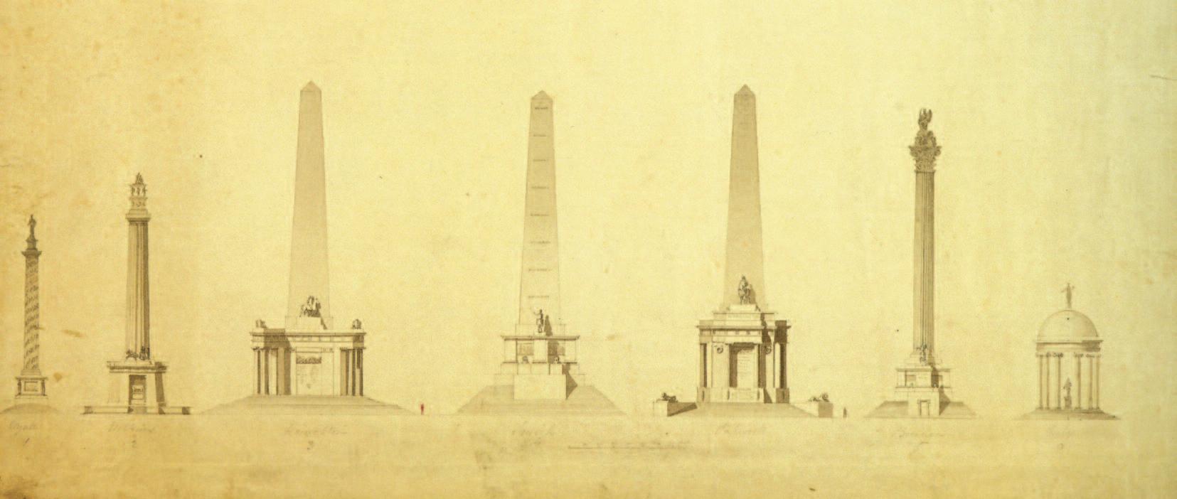 Top: Ink and wash drawings of the six shortlisted designs for the Wellington Testimonial