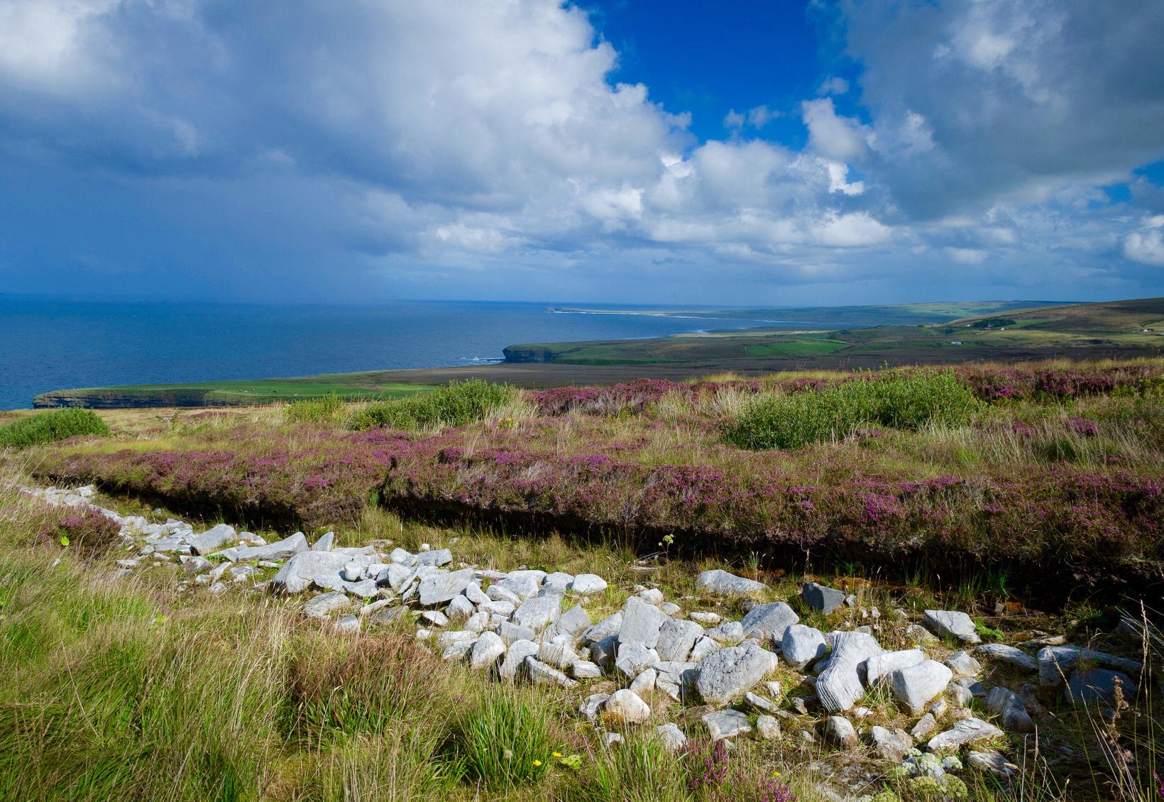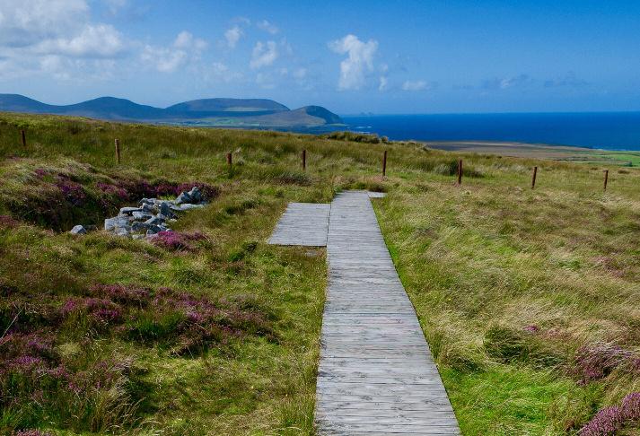 The story of Céide Fields, the most extensive Stone Age monument in the world, is truly a fascinating one. In the 1930s Patrick Caulfield, a local school master in North Mayo noticed lines of stones in the ground when cutting turf and realised that they must pre-date the bog. However, it wasn’t until 40 years later his son, Professor Séamas Caulfield, an archaeologist, began excavating the site with his students to look for evidence of the community that lived there 5,000 years ago In 1990, the OPW worked with Séamas and the local community to build the award-winning visitor and exhibition centre The building is designed around a four and a half thousand year old pine tree The exhibitions in the Centre are arranged around three main themes - the natural landscape, the human imprint on the landscape and the geology of the stunning North Mayo coast The real experience of the Céide Fields however, is the walking tour with the Visitor Centre guides who bring the site to life by helping visitors to imagine walking in the steps of our ancestors from 5,000 years ago
