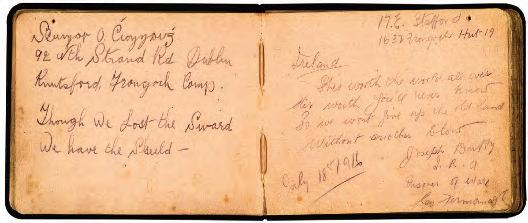 The Kilmainham Autographs Collection is a trove of approx 60 personal notebooks owned by individuals associated with the 1916 Rising and containing the personal signatures and reminiscences of many people from the revolutionary movement. The origins of most of the books date from the 1916 period and its aftermath, when large numbers of the insurgents were held prisoner by the British authorities and held in jails throughout the United Kingdom. Scraps of verse, prayers, personal