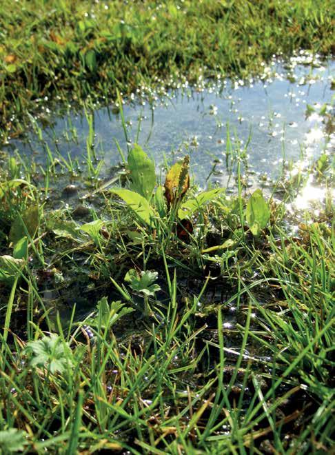 Do not walk on a waterlogged lawn. Wait until it is dry and gently aerate the top soil with a fork to about 13cm. Work some coarse limefree sand into the holes and reseed any bald patches.