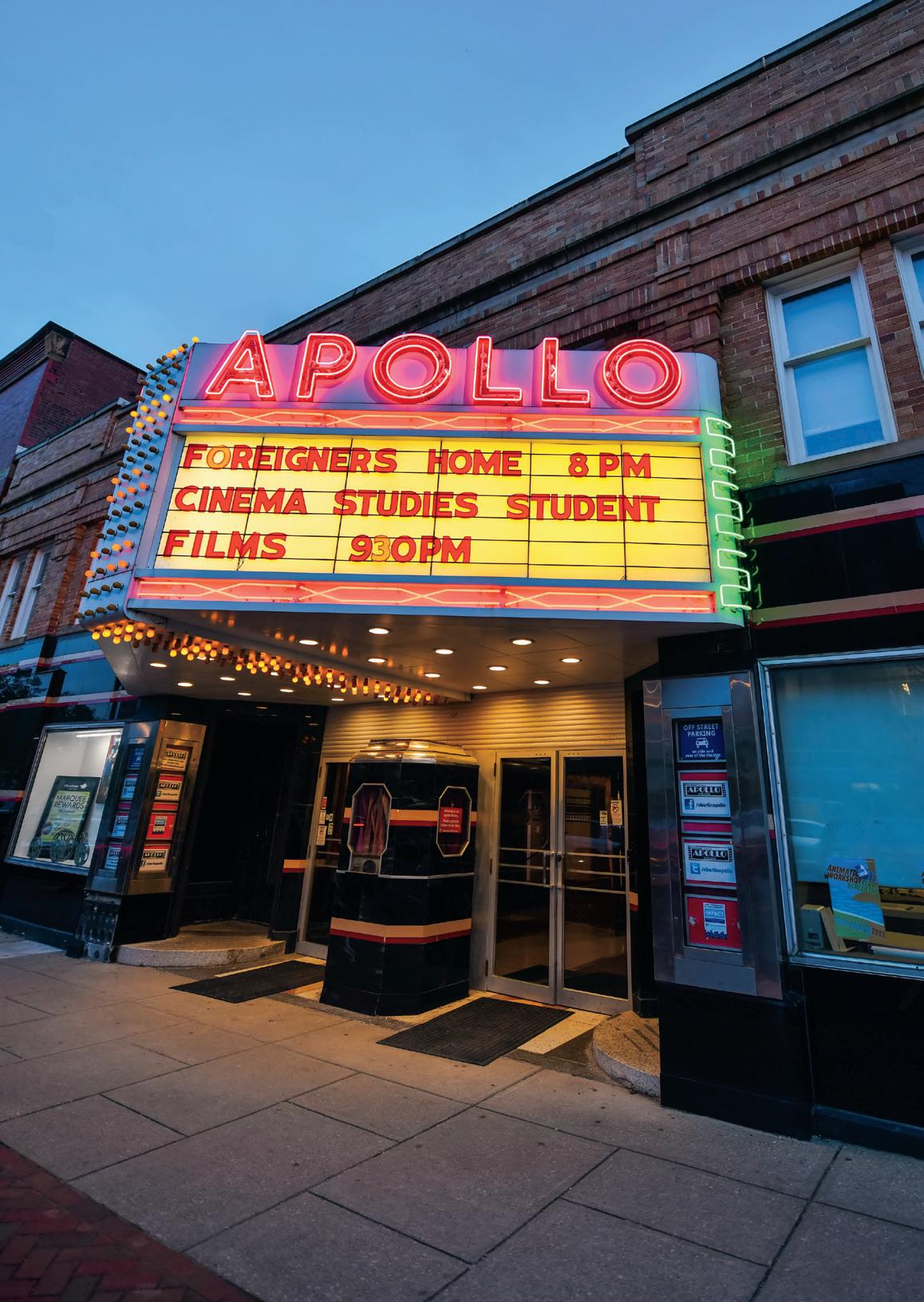 The Apollo Theatre, Oberlin’s 1913 art-deco moviehouse, is known for running first-run films at cheap prices—including Free Movie Monday for students. Renovated in 2011, the Apollo also serves as a space for the college’s Cinema Studies Program. Students can record and edit their work in the media education center and show their films in a 61-seat screening room.