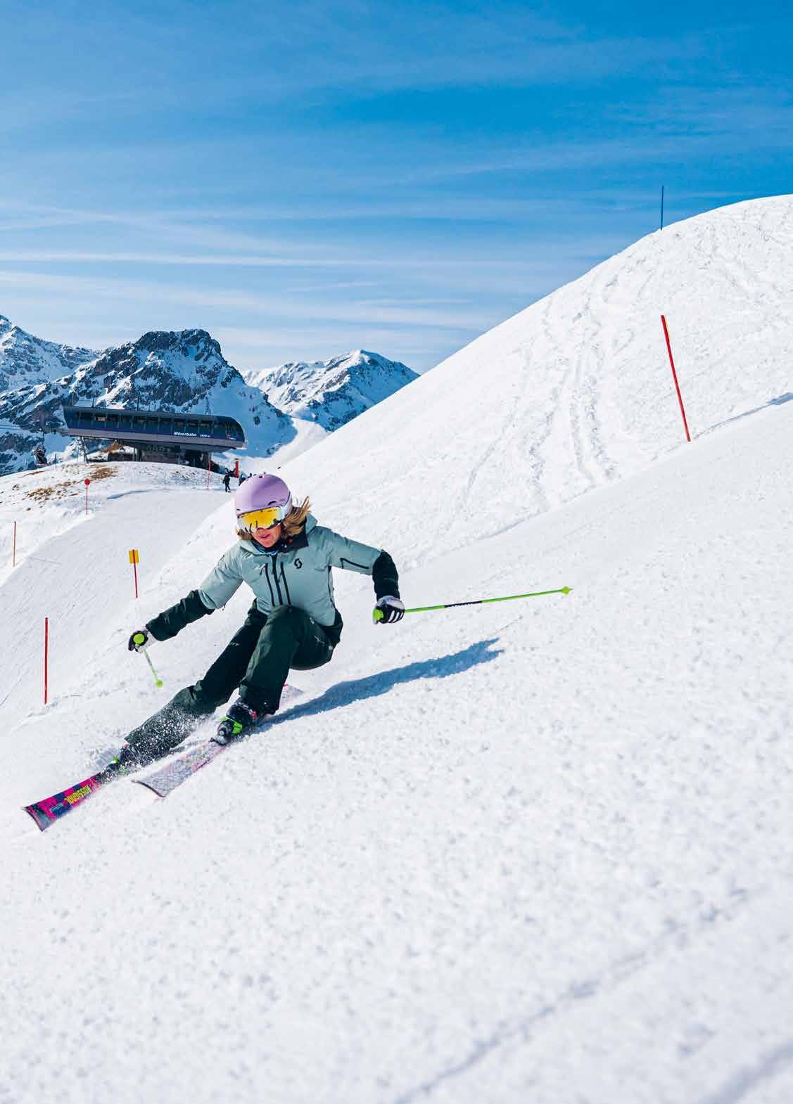 Immer in Bewegung: Ob auf 36 Pistenkilometern mit den beiden schneesicheren Talabfahrten oder actionreich mit der Crystal Family – das vollkommene Erlebnis zeichnet das Zwei-Länder-Skigebiet durch den „Dynamischen“, das Fell horn, und den „Grenzenlosen“, die Kanzelwand, aus. Das Snowboard- und Freestyle-Highlight mit leichten bis mittle ren Kickerlines und einfachen Hindernissen ist auch für An fänger zu schaffen. Vorher wird noch gemeinsam in der Familienbande geübt: Zwischen der Bergstation und der Sta tion Höfle verläuft eine blaue Familienabfahrt, die perfekt für den dynamischen Start in das 2-Länder-Skierlebnis ist.