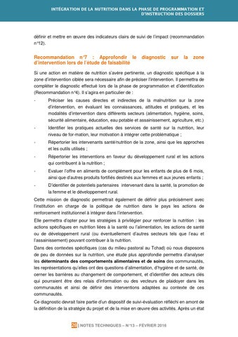 Si une action en matière de nutrition s’avère pertinente, un diagnostic spécifique à la zone d’intervention ciblée sera nécessaire afin de préciser l’intervention. Il permettra de compléter le diagnostic effectué lors de la phase de programmation et d’identification (Recommandation n°4). Il s’agira en particulier de : -