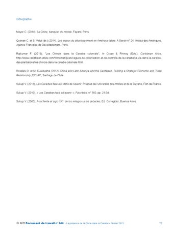 Meyer C. (2014), La Chine, banquier du monde, Fayard, Paris. Quenan C. et S. Velut (dir.) (2014), Les enjeux du développement en Amérique latine, A Savoir n° 24, Institut des Amériques, Agence Française de Développement, Paris. Rajkumar F. (2013), "Les Chinois dans la Caraïbe coloniale", In Cruse & Rhiney (Eds.), Caribbean Atlas, http://www.caribbean-atlas.com/fr/thematiques/vagues-de-colonisation-et-de-controle-de-la-caraibe/la-vie-dans-la-caraibedes-plantations/les-chinois-dans-la-caraibe-coloniale.html. Rosales O. et M. Kuwayama (2012), China and Latin America and the Caribbean, Building a Strategic Economic and Trade Relationship, ECLAC, Santiago de Chile. Sukup V. (2013), Les Caraïbes face aux défis de l’avenir, Presses de l’université des Antilles et de la Guyane, Fort-de-France. Sukup V. (2010), « Les Caraïbes face à l’avenir », Futuribles, n° 360, pp. 21-34. Sukup V. (2000), Asia frente al siglo XXI: de los milagros a las debacles, Ed. Corregidor, Buenos-Aires.