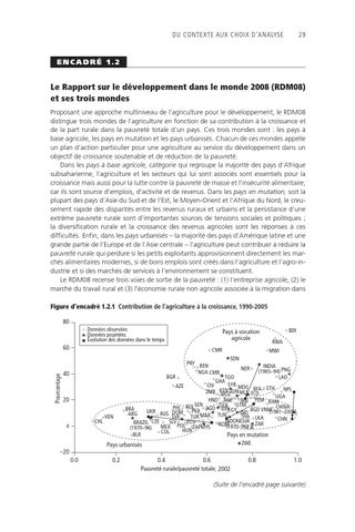 Le Rapport sur le développement dans le monde 2008 (RDM08) et ses trois mondes Proposant une approche multiniveau de l’agriculture pour le développement, le RDM08 distingue trois mondes de l’agriculture en fonction de sa contribution à la croissance et de la part rurale dans la pauvreté totale d’un pays. Ces trois mondes sont : les pays à base agricole, les pays en mutation et les pays urbanisés. Chacun de ces mondes appelle un plan d’action particulier pour une agriculture au service du développement dans un objectif de croissance soutenable et de réduction de la pauvreté. Dans les pays à base agricole, catégorie qui regroupe la majorité des pays d’Afrique subsaharienne, l’agriculture et les secteurs qui lui sont associés sont essentiels pour la croissance mais aussi pour la lutte contre la pauvreté de masse et l’insécurité alimentaire, car ils sont source d’emplois, d’activité et de revenus. Dans les pays en mutation, soit la plupart des pays d’Asie du Sud et de l’Est, le Moyen-Orient et l’Afrique du Nord, le creusement rapide des disparités entre les revenus ruraux et urbains et la persistance d’une extrême pauvreté rurale sont d’importantes sources de tensions sociales et politiques ; la diversification rurale et la croissance des revenus agricoles sont les réponses à ces difficultés. Enfin, dans les pays urbanisés – la majorité des pays d’Amérique latine et une grande partie de l’Europe et de l’Asie centrale – l’agriculture peut contribuer à réduire la pauvreté rurale qui perdure si les petits exploitants approvisionnent directement les marchés alimentaires modernes, si de bons emplois sont créés dans l’agriculture et l’agro-industrie et si des marchés de services à l’environnement se constituent. Le RDM08 recense trois voies de sortie de la pauvreté : (1) l’entreprise agricole, (2) le marché du travail rural et (3) l’économie rurale non agricole associée à la migration dans Figure d’encadré 1.2.1 Contribution de l’agriculture à la croissance, 1990-2005 80 Données observées Données projetées Évolution des données dans le temps
