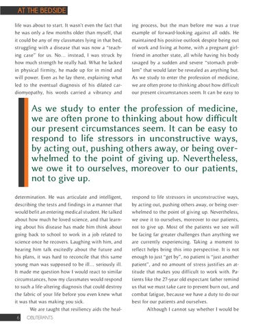 As we study to enter the profession of medicine, we are often prone to thinking about how difficult our present circumstances seem. It can be easy to respond to life stressors in unconstructive ways, by acting out, pushing others away, or being overwhelmed to the point of giving up. Nevertheless, we owe it to ourselves, moreover to our patients, not to give up. determination. He was articulate and intelligent, describing the tests and findings in a manner that would befit an entering medical student. He talked about how much he loved science, and that learning about his disease has made him think about going back to school to work in a job related to science once he recovers. Laughing with him, and hearing him talk excitedly about the future and his plans, it was hard to reconcile that this same young man was supposed to be ill… seriously ill. It made me question how I would react to similar circumstances, how my classmates would respond to such a life-altering diagnosis that could destroy the fabric of your life before you even knew what it was that was making you sick. We are taught that resiliency aids the heal6