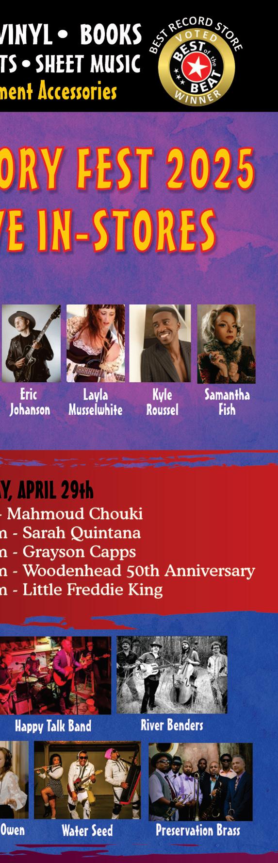 Over the years, OBeat has grown and changed despite many setbacks. We got through Katrina. We got through COVID (barely). We produced several CDs (that ancient format!) of Louisiana musicians that were used by the Louisiana Office of Tourism to promote Louisiana music. It was a pleasure to be able to honor musicians and music businesses with OBeat’s “Best of The Beat Awards.” Over the past 25 years. OBeat created the firstever comprehensive “Louisiana Music Directory” of musicians, bands and music businesses throughout the state of Louisiana, which was an invaluable tool for the music industry cohort to communicate with each other and to let the “outside world” know how to get in touch with virtually everyone in music and the music business (it hasn’t yet been replicated). Currently