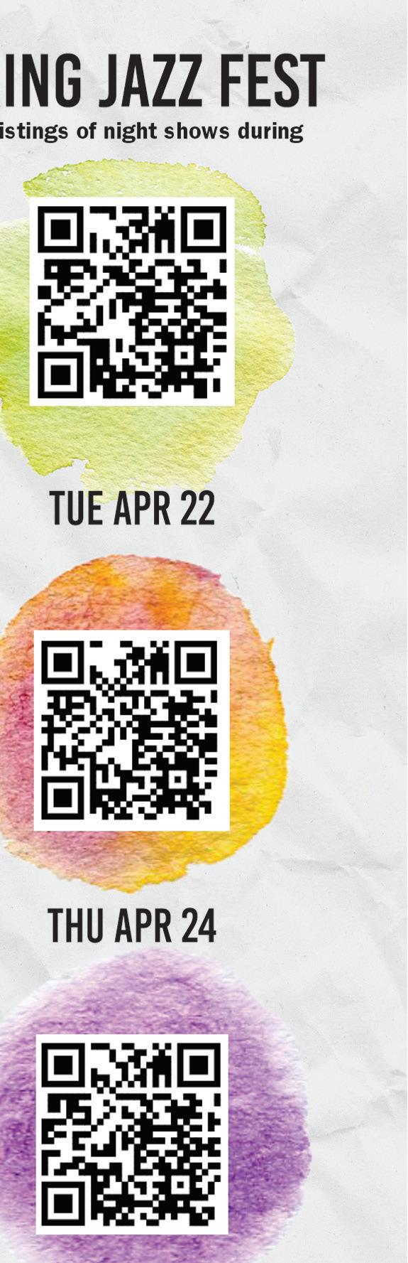 YYellowjackets , 5/1, JAZ, 5:45p: Jazz band that has won two Grammys and 17 Grammy nominations. They were formed as the backup band for guitarist Robben Ford. Founding member Russell Ferrante (piano and synthesizers) says there is no leader, and that the musicians come together as four equal parts. They play ballads and jazz fusion. They include Bob Mintzer on woodwinds, Dane Alderson on bass and Will Kennedy on drums.