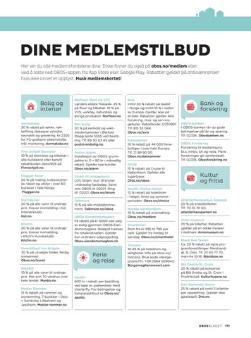DINE MEDLEMSTILBUD Her ser du alle medlemsfordelene dine. Disse finner du også på obos.no/medlem eller ved å laste ned OBOS-appen fra App Store eller Google Play. Rabatter gjelder på ordinære priser hvis ikke annet er opplyst. Husk medlemskortet!