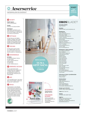 Design og art direction Steffen Olsen (spoonagency.no) Trykk Aller Trykk AS Opplag 375 000. ISSN: 0807-9323 Utgitt av OBOS, Hammersborg torg 1, Pb 6666 St. Olavs plass 0129 Oslo. Tlf. 02333 (sentralbord) obosbladet@obos.no
