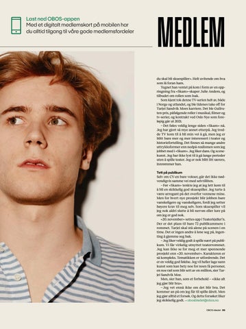 MEDLEM du skal bli skuespiller». Helt uvitende om hva som lå foran ham. Tegnet han ventet på kom i form av en oppringning fra «Skam»-skaper Julie Andem, og tilbudet om rollen som Isak. Som kjent tok denne TV-serien helt av, både i Norge og utlandet, og ble tidenes take off for Tarjei Sandvik Moes karriere. Det ble Gullruten-pris, påfølgende roller i musikal, filmer og tv-serier, og kontrakt ved Oslo Nye som foreløpig går ut 2021. – Det føles veldig lenge siden «Skam» nå. Jeg har gjort så mye annet etterpå. Jeg trodde TV kom til å bli min vei å gå, men jeg er blitt bare mer og mer interessert i teater og historiefortelling. Det finnes så mange andre uttrykksformer enn nedpå-realismen som jeg jobbet med i «Skam». Jeg liker dans. Og scenekunst. Jeg har ikke lyst til å gå lange perioder uten å spille teater. Jeg er nok blitt litt særere, innrømmer han. Tett på publikum Selv om CV-en bare vokser, går det ikke nødvendigvis samme vei med selvtilliten. – Før «Skam» tenkte jeg at jeg lett kom til å bli en skikkelig god skuespiller. Jeg turte å være arrogant på det overfor vennene mine. Men for hvert nye prosjekt blir jobben bare vanskeligere og vanskeligere, fordi jeg setter høyere krav til meg selv. Som skuespiller vil jeg nok aldri slutte å bli nervøs eller lure på om jeg er god nok. «20. november» settes opp i Teaterkjeller’n. Der er det plass til bare 72 publikummere i rommet. Tarjei skal stå alene på scenen i en time. Det er ingen andre å lene seg på, ingenting å gjemme seg bak. – Jeg liker veldig godt å spille nært på publikum. Vi får virkelig utnyttet teaterrommet. Jeg kan ikke se for meg et mer spennende prosjekt enn «20. november». Karakteren er så kompleks. Tematikken er utfordrende. Det er en veldig god følelse. Jeg vil heller lage sann kunst som kan bety noe for noen få personer, en noe ræl som blir sett av en million, sier Tarjei Sandvik Moe. Men, sier han, som et forbehold – «ikke alt jeg gjør blir bra». – Jeg vet ennå ikke om det blir bra. Det kommer an på om jeg får til spille ålreit. Men jeg gjør alltid et forsøk. Og dette forsøket liker jeg skikkelig godt. → obosbladet@obos.no OBOS-bladet 99