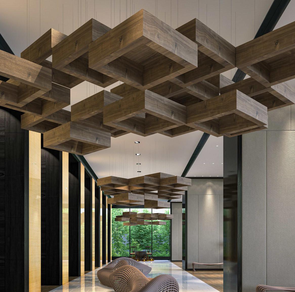 Madera curvada en detalles arquitectónicos y el mobiliario.
