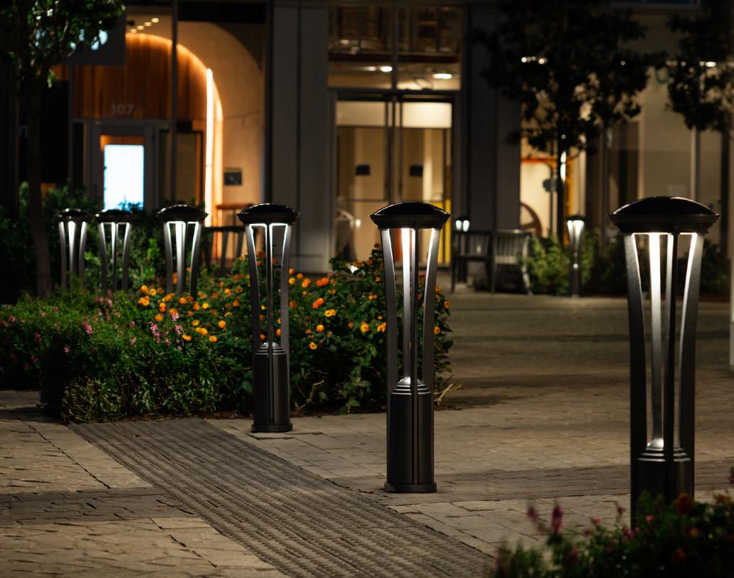 Postes tipo centinela que demarquen el área como un destino recreativo y vegetación para crear un entorno acogedor.