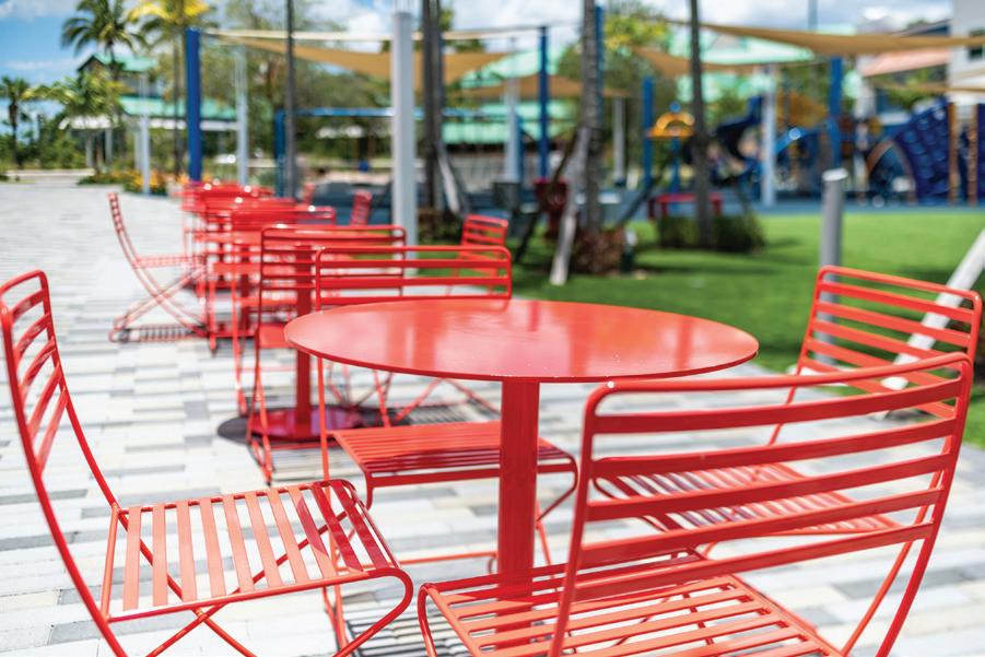 Bancos multifuncionales (como los Austin Benches, de la firma Landscape Forms) que permitan realizar ejercicios isométricos y pliométricos, además de brindar un lugar seguro para descansar entre actividades.