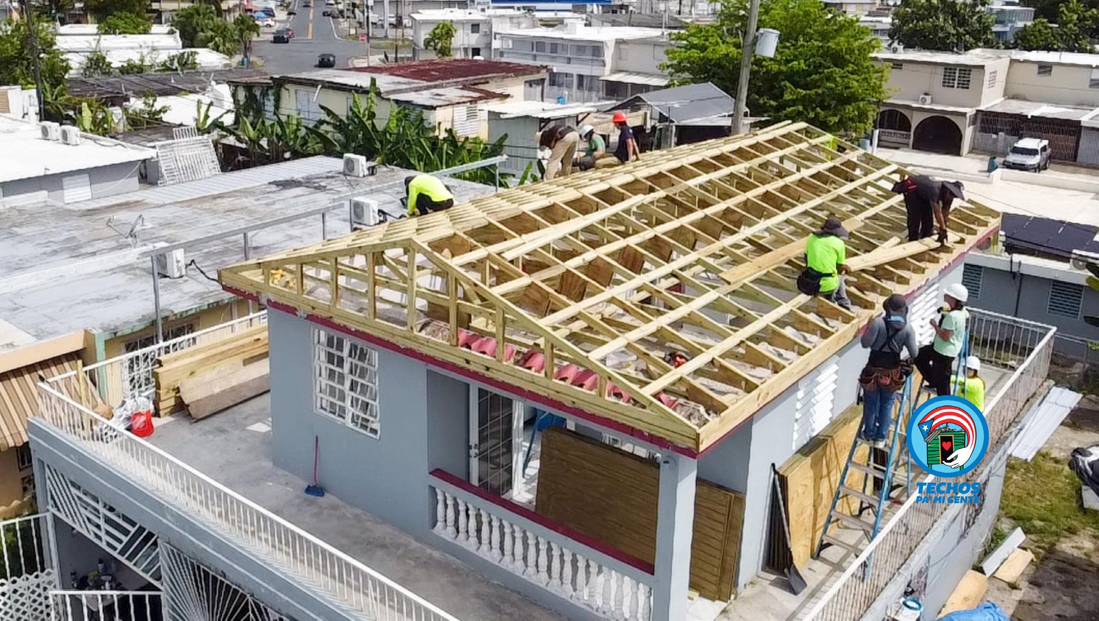 Gente con OBRA Sí, quedan todavía casas con toldos azules en Puerto Rico. Por eso existe la organización sin fines de lucro Techos Pa’ Mi Gente.