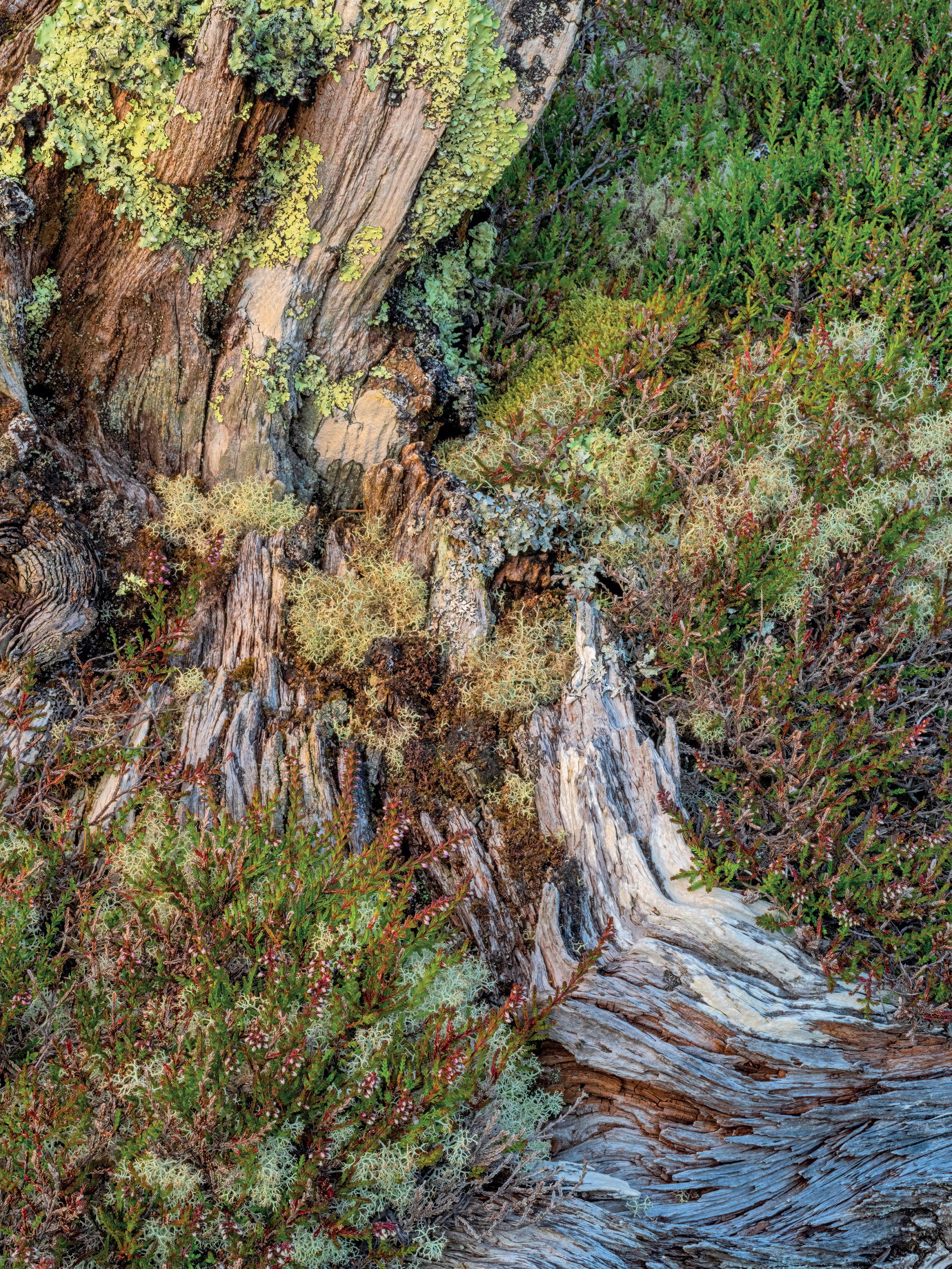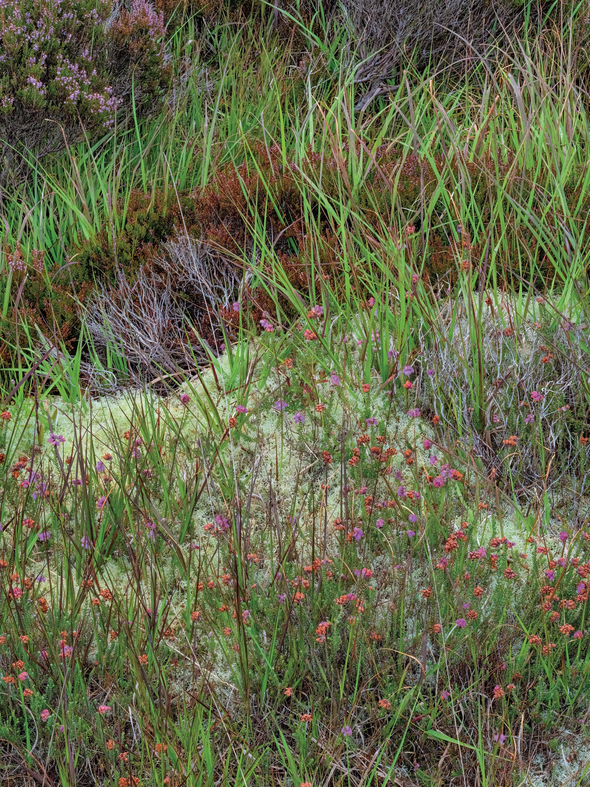 There is, of course, one feature they all have in common: peat. This unmistakable squelchy substance is made of (mostly) plant and (to a lesser extent) animal remains that have accumulated under (more or less) water-saturated conditions. Oxygen availability in water is considerably lower than it is in air, and the little oxygen available in water-logged ground is quickly used up by microorganisms, resulting in a very low oxygen (hypoxic) or even oxygen free (anoxic) environment. These conditions prevent the full decomposition of any natural matter, so instead of being transformed into soil, dead plants and animals remain in limbo, neither fully preserved nor fully decomposed, and build up over decades, centuries and millennia, layer upon layer. The result of this process is peat, a wet concoction that comes in various shades of russet, its consistency dictated by the plants and animals that compose it. Anything that falls onto the surface or forms part of the top layer of vegetation – leaves, flowers, stems, roots and rhizomes, mosses, lichen, any unfortunate insect, bird or other animal or indeed human – is partially recycled and partially preserved in the growing layers of peat.